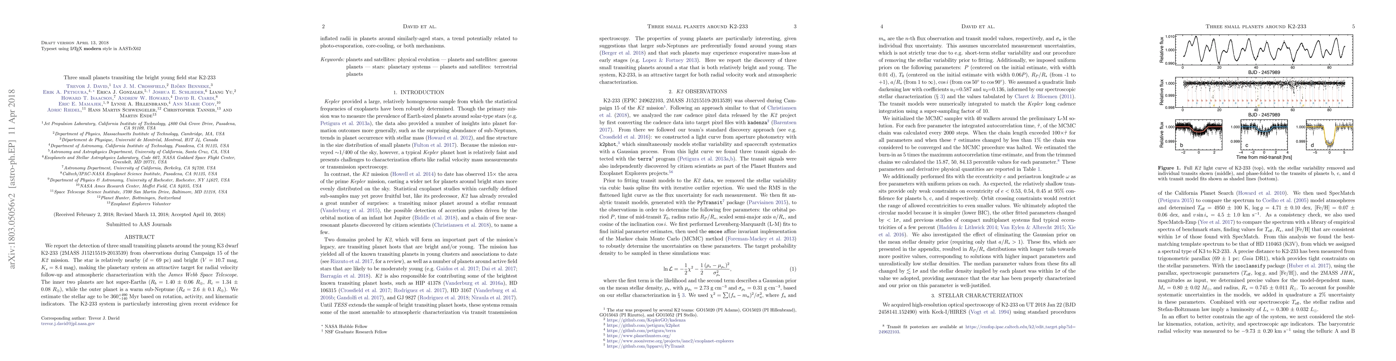 This paper reports the discovery of three small transiting planets orbiting the young K3 dwarf K2-233, including two hot super-Earths and a warm sub-Neptune. The system is notable for its proximity and brightness, making it a prime target for follow-up studies and atmospheric analysis.