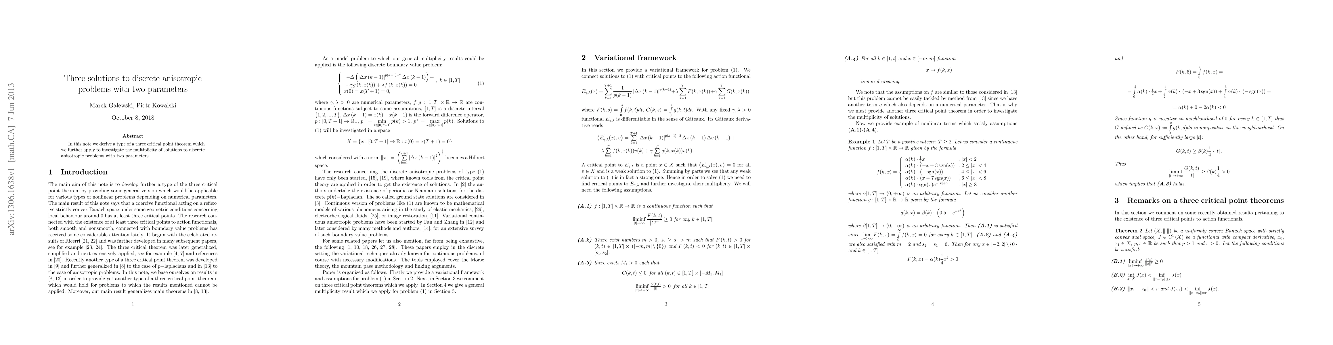 In this note we derive a type of a three critical point theorem which we further apply to investigate the multiplicity of solutions to discrete anisotropic problems with two parameters.