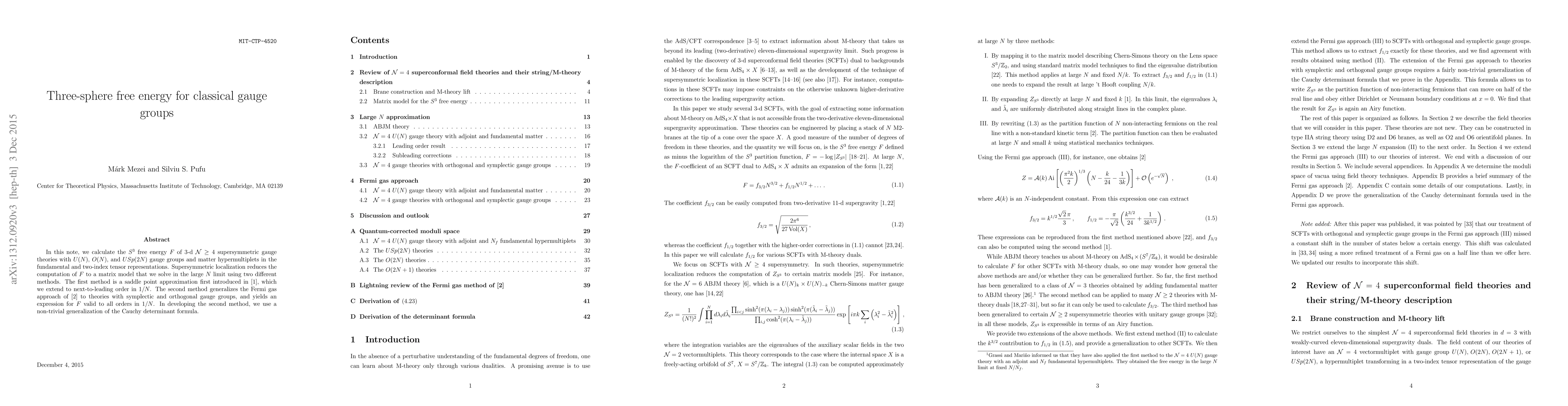 In this note, we calculate the $S^3$ free energy $F$ of 3-d ${\cal N}\geq 4$ supersymmetric gauge theories with $U(N)$, $O(N)$, and $USp(2N)$ gauge groups and matter hypermultiplets in the fundamental and two-index tensor representations. Supersymmetric localization reduces the computation of $F$ to a matrix model that we solve in the large $N$ limit using two different methods. The first method is a saddle point approximation first introduced in arXiv:1011.5487, which we extend to next-to-leading order in $1/N$. The second method generalizes the Fermi gas approach of arXiv:1110.4066 to theories with symplectic and orthogonal gauge groups, and yields an expression for $F$ valid to all orders in $1/N$. In developing the second method, we use a non-trivial generalization of the Cauchy determinant formula.