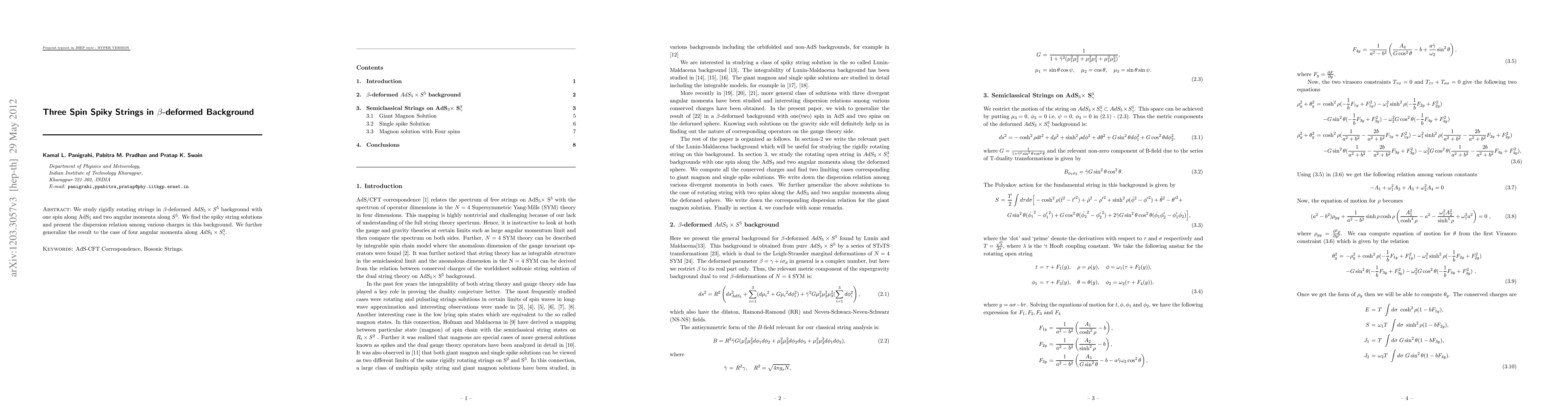 This paper investigates rigidly rotating strings in a beta-deformed $AdS_5\times S^5$ background, focusing on strings with one spin along $AdS_5$ and two along $S^5$. It identifies spiky string solutions and provides the dispersion relation among various charges, extending the findings to configurations with four angular momenta.