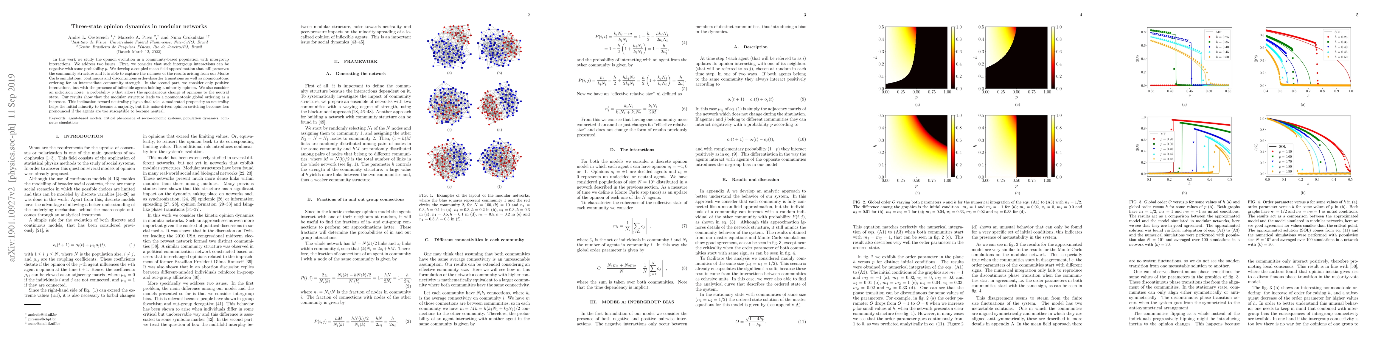 In this work we study the opinion evolution in a community-based population with intergroup interactions. We address two issues. First, we consider that such intergroup interactions can be negative with some probability $p$. We develop a coupled mean-field approximation that still preserves the community structure and it is able to capture the richness of the results arising from our Monte Carlo simulations: continuous and discontinuous order-disorder transitions as well as nonmonotonic ordering for an intermediate community strength. In the second part, we consider only positive interactions, but with the presence of inflexible agents holding a minority opinion. We also consider an indecision noise: a probability $q$ that allows the spontaneous change of opinions to the neutral state. Our results show that the modular structure leads to a nonmonotonic global ordering as $q$ increases. This inclination toward neutrality plays a dual role: a moderated propensity to neutrality helps the initial minority to become a majority, but this noise-driven opinion switching becomes less pronounced if the agents are too susceptible to become neutral.