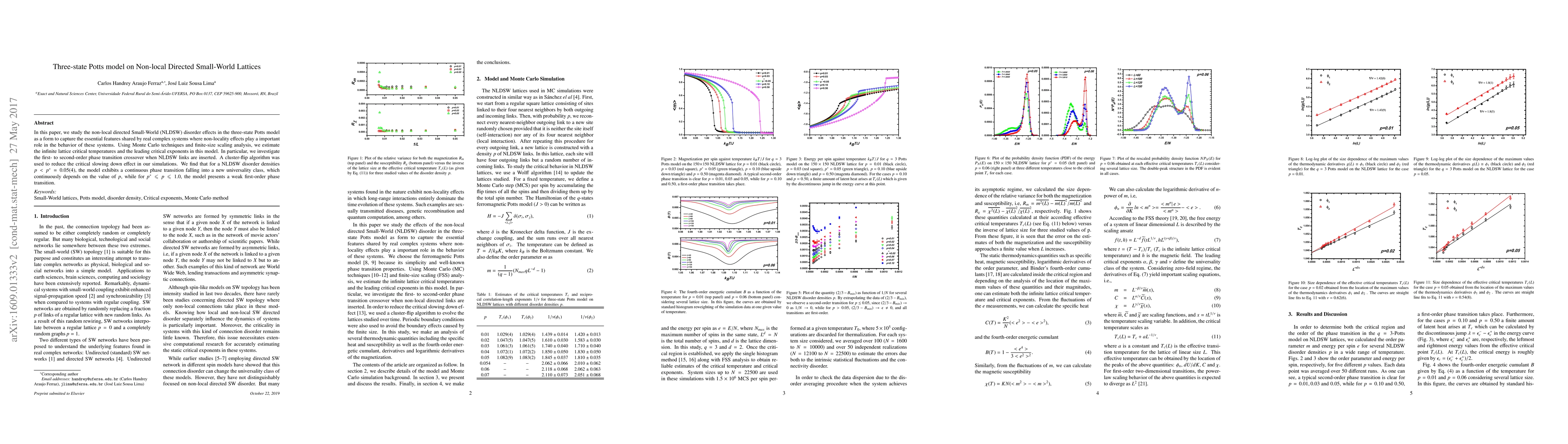 The three-state Potts model on non-local directed small-world lattices exhibits a continuous phase transition at low disorder densities, transitioning to a weak first-order transition at higher densities.