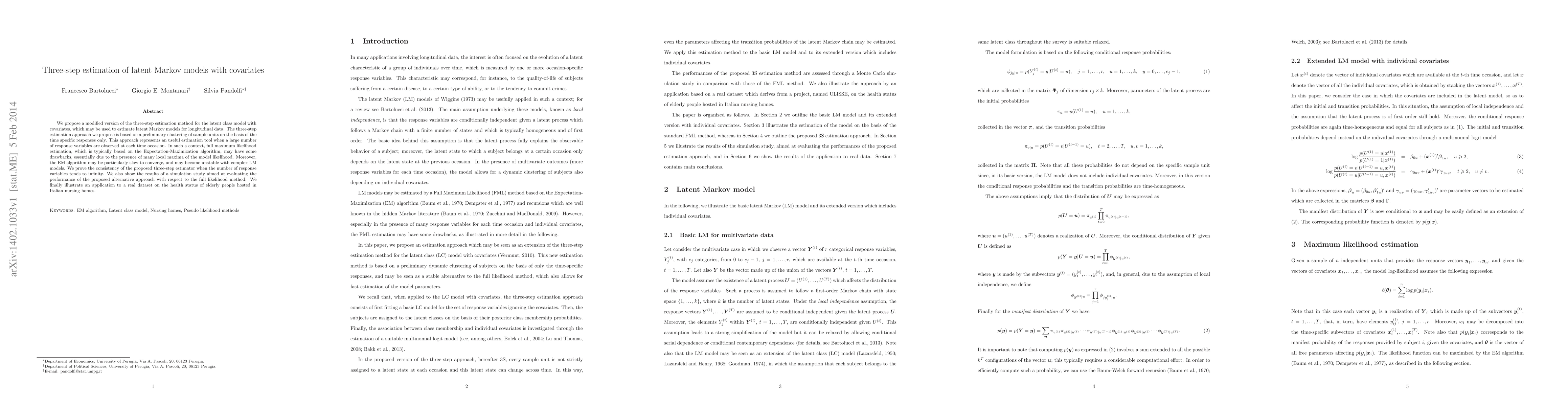 This paper proposes a modified three-step estimation method for latent Markov models with covariates, offering an alternative to full maximum likelihood estimation. It demonstrates the method's consistency and evaluates its performance through a simulation study and a real-world application to elderly health data.
