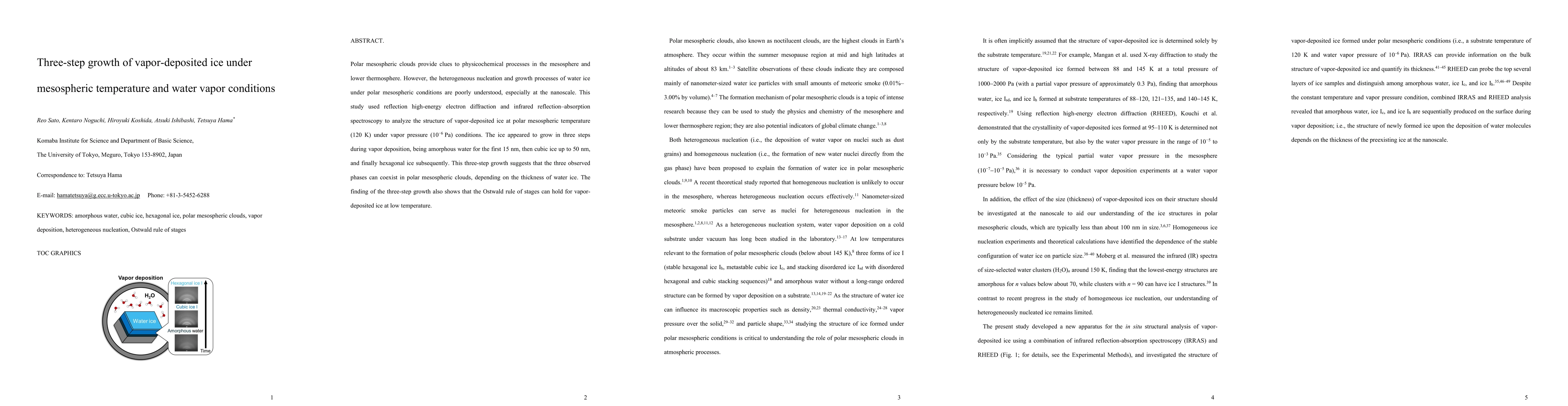 Polar mesospheric clouds provide clues to physicochemical processes in the mesosphere and lower thermosphere. However, the heterogeneous nucleation and growth processes of water ice under polar mesospheric conditions are poorly understood, especially at the nanoscale. This study used reflection high energy electron diffraction and infrared reflection absorption spectroscopy to analyze the structure of vapor-deposited ice at polar mesospheric temperature (120 K) under vapor pressure conditions. The ice appeared to grow in three steps during vapor deposition, being amorphous water for the first 15 nm, then cubic ice up to 50 nm, and finally hexagonal ice subsequently. This three step growth suggests that the three observed phases can coexist in polar mesospheric clouds, depending on the thickness of water ice. The finding of the three-step growth also shows that the Ostwald rule of stages can hold for vapor deposited ice at low temperature.