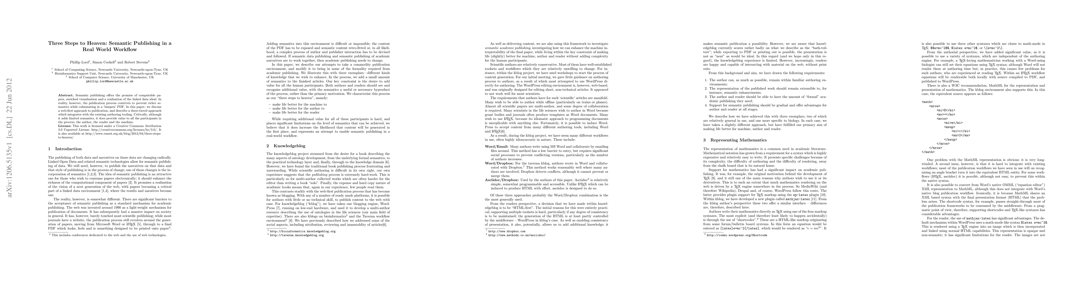 Semantic publishing offers the promise of computable papers, enriched visualisation and a realisation of the linked data ideal. In reality, however, the publication process contrives to prevent richer semantics while culminating in a `lumpen' PDF. In this paper, we discuss a web-first approach to publication, and describe a three-tiered approach which integrates with the existing authoring tooling. Critically, although it adds limited semantics, it does provide value to all the participants in the process: the author, the reader and the machine.