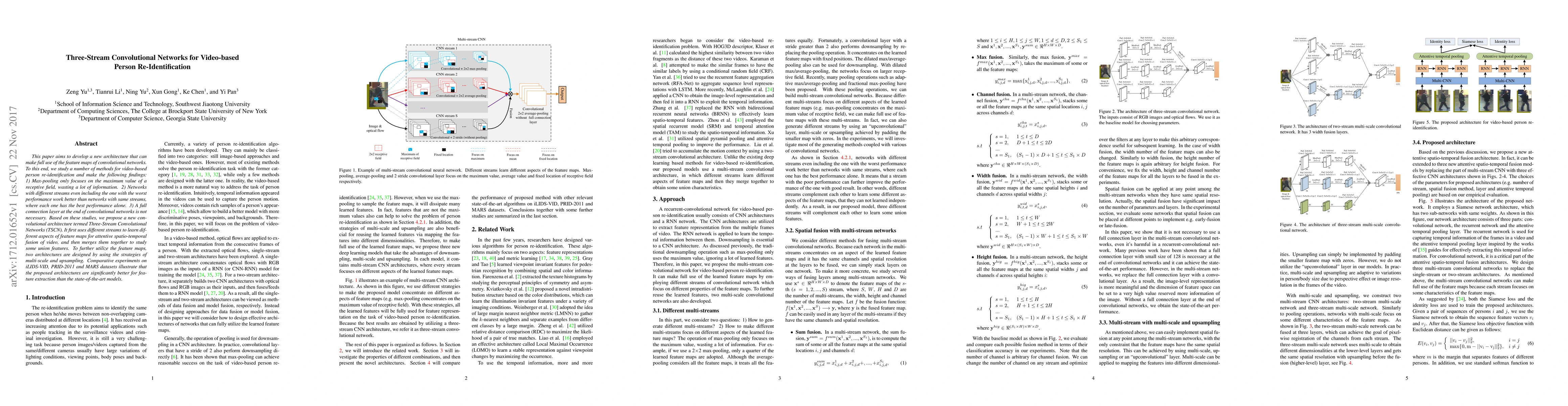 This paper proposes Three-Stream Convolutional Networks (TSCN) for video-based person re-identification, utilizing different streams to learn diverse aspects of feature maps for effective spatio-temporal fusion. Experiments show TSCN outperforms state-of-the-art models on multiple datasets.