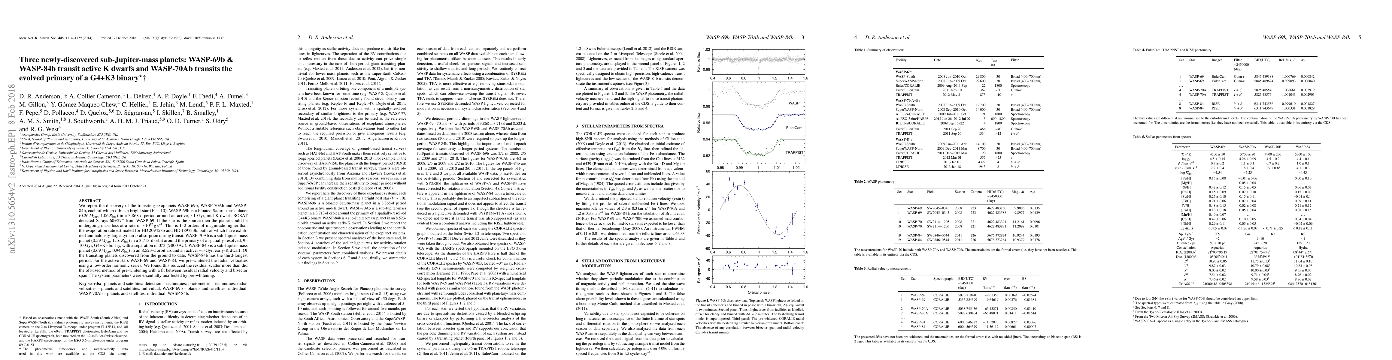 This paper reports the discovery of three transiting exoplanets: WASP-69b, WASP-70Ab, and WASP-84b. WASP-69b orbits an active mid-K dwarf, potentially experiencing high mass-loss rates. WASP-70Ab orbits the primary of an old G4+K3 binary system, while WASP-84b orbits an active early-K dwarf, having the third-longest period among ground-discovered transiting planets.