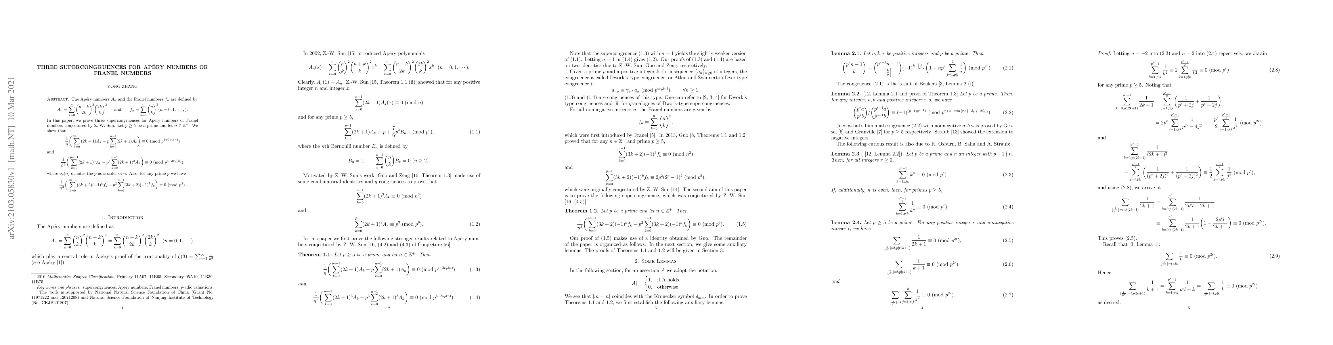 This paper proves three supercongruences for Apéry and Franel numbers, conjectured by Z.-W. Sun. It establishes congruences modulo powers of prime $p$ for sums involving these numbers, specifically showing relationships for $p \geq 5$.