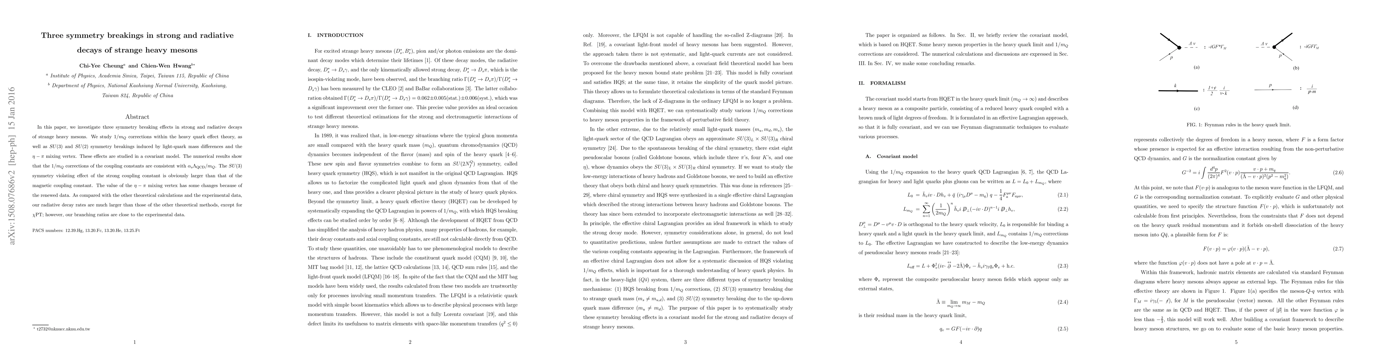 In this paper, we investigate three symmetry breaking effects in strong and radiative decays of strange heavy mesons. We study 1/m_Q corrections within the heavy quark effect theory, as well as SU(3) and SU(2) symmetry breakings induced by light quark mass differences and the \eta-\pi mixing vertex. These effects are studied in a covariant model. The numerical results show that the 1/m_Q corrections of the coupling constants are consistent with \alpha_s \Lambda_{QCD}/m_Q. The SU(3) symmetry violating effect of the strong coupling constant is obviously larger than that of the magnetic coupling constant. The value of the \eta-\pi mixing vertex has some changes because of the renewed data. As compared with the other theoretical calculations and the experimental data, our radiative decay rates are much larger than those of the other theoretical methods, except for \chiPT; however, our branching ratios are close to the experimental data.