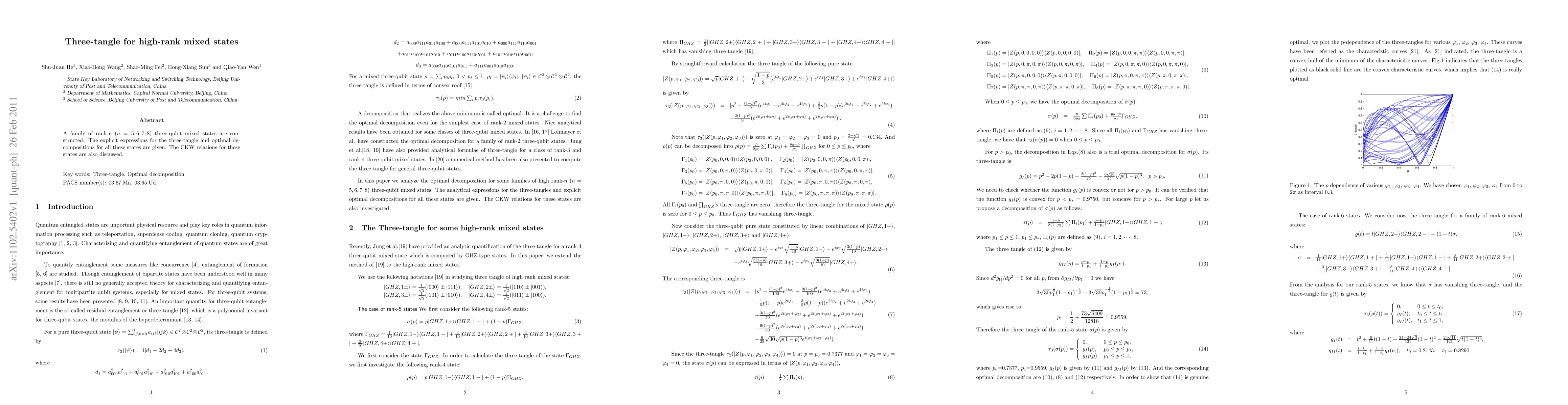 This paper constructs rank-n three-qubit mixed states for n=5 to 8, providing explicit expressions for their three-tangle and optimal decompositions. It also examines the CKW relations for these states.