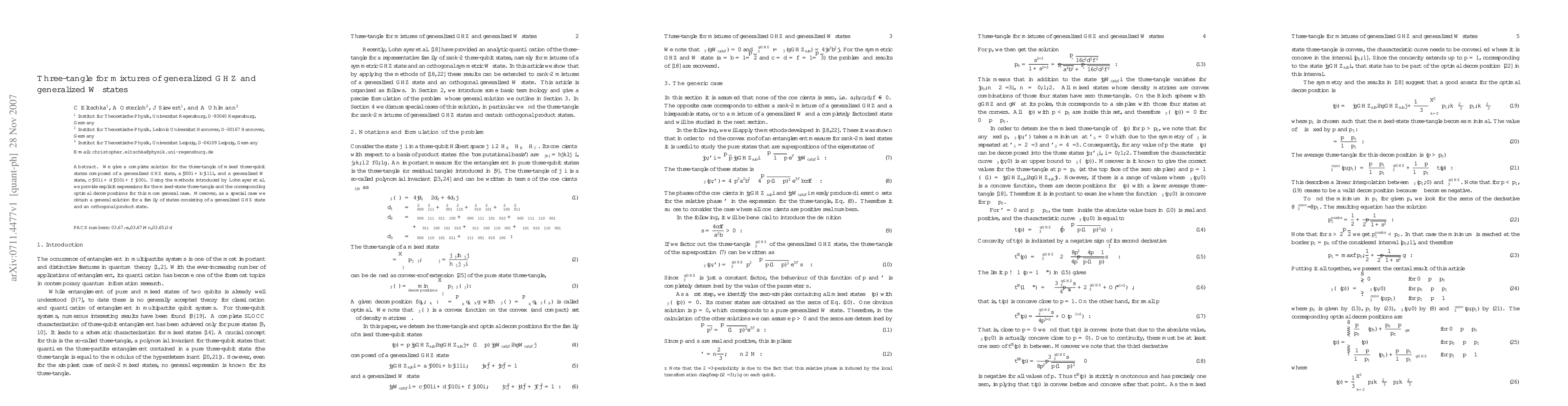 We give a complete solution for the three-tangle of mixed three-qubit states composed of a generalized GHZ state, a|000>+b|111>, and a generalized W state, c|001>+d|010>+f|100>. Using the methods introduced by Lohmayer et al. we provide explicit expressions for the mixed-state three-tangle and the corresponding optimal decompositions for this more general case. Moreover, as a special case we obtain a general solution for a family of states consisting of a generalized GHZ state and an orthogonal product state.