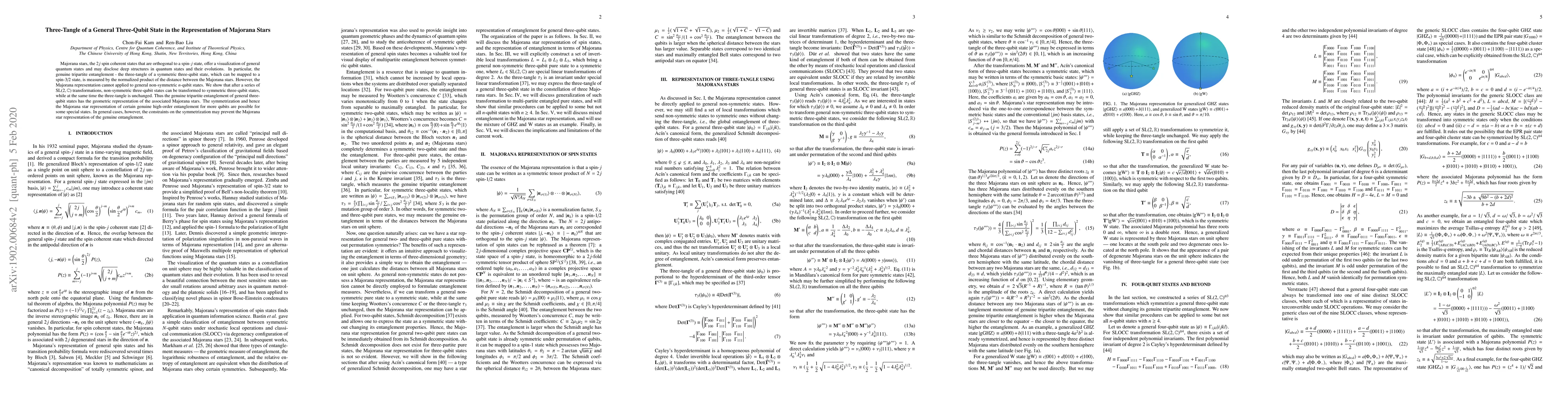 Majorana stars, the $2j$ spin coherent states that are orthogonal to a spin-$j$ state, offer a visualization of general quantum states and may disclose deep structures in quantum states and their evolutions. In particular, the genuine tripartite entanglement - the three-tangle of a symmetric three-qubit state, which can be mapped to a spin-3/2 state, is measured by the normalized product of the distance between the Majorana stars. However, the Majorana representation cannot applied to general non-symmetric $n$-qubit states. We show that after a series of SL$(2,\mathbb{C})$ transformations, non-symmetric three-qubit states can be transformed to symmetric three-qubit states, while at the same time the three-tangle is unchanged. Thus the genuine tripartite entanglement of general three-qubit states has the geometric representation of the associated Majorana stars. The symmetrization and hence the Majorana star representation of certain genuine high-order entanglement for more qubits are possible for some special states. In general cases, however, the constraints on the symmetrization may prevent the Majorana star representation of the genuine entanglement.