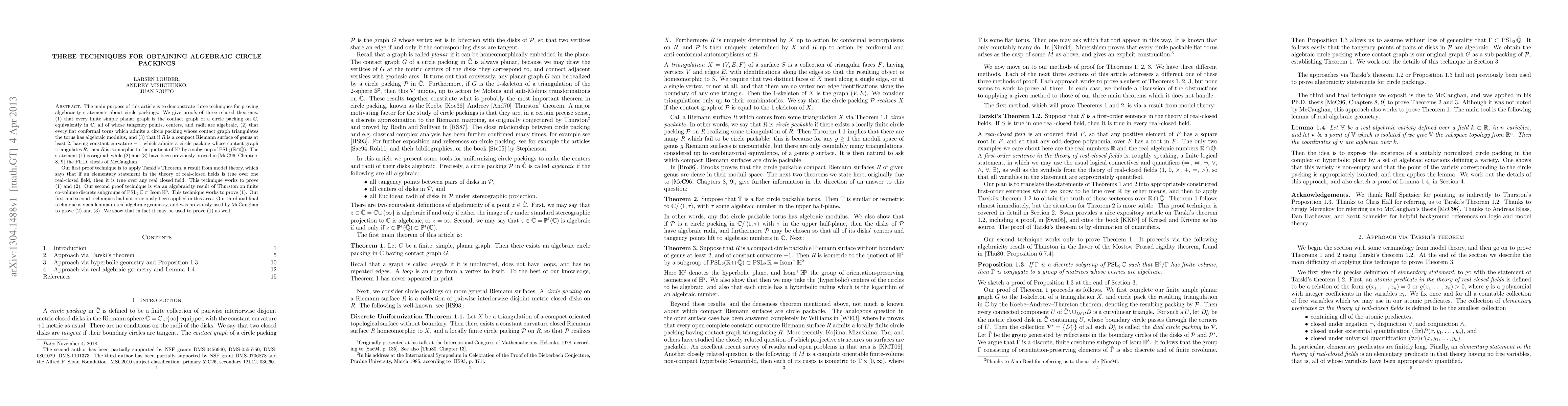 The main purpose of this article is to demonstrate three techniques for proving algebraicity statements about circle packings. We give proofs of three related theorems: (1) that every finite simple planar graph is the contact graph of a circle packing on the Riemann sphere, equivalently in the complex plane, all of whose tangency points, centers, and radii are algebraic, (2) that every flat conformal torus which admits a circle packing whose contact graph triangulates the torus has algebraic modulus, and (3) that if R is a compact Riemann surface of genus at least 2, having constant curvature -1, which admits a circle packing whose contact graph triangulates R, then R is isomorphic to the quotient of the hyperbolic plane by a subgroup of PSL_2(real algebraic numbers). The statement (1) is original, while (2) and (3) have been previously proved in the Ph.D. thesis of McCaughan. Our first proof technique is to apply Tarski's Theorem, a result from model theory, which says that if an elementary statement in the theory of real-closed fields is true over one real-closed field, then it is true over any real closed field. This technique works to prove (1) and (2). Our second proof technique is via an algebraicity result of Thurston on finite co-volume discrete subgroups of the orientation-preserving-isometry group of hyperbolic 3-space. This technique works to prove (1). Our first and second techniques had not previously been applied in this area. Our third and final technique is via a lemma in real algebraic geometry, and was previously used by McCaughan to prove (2) and (3). We show that in fact it may be used to prove (1) as well.