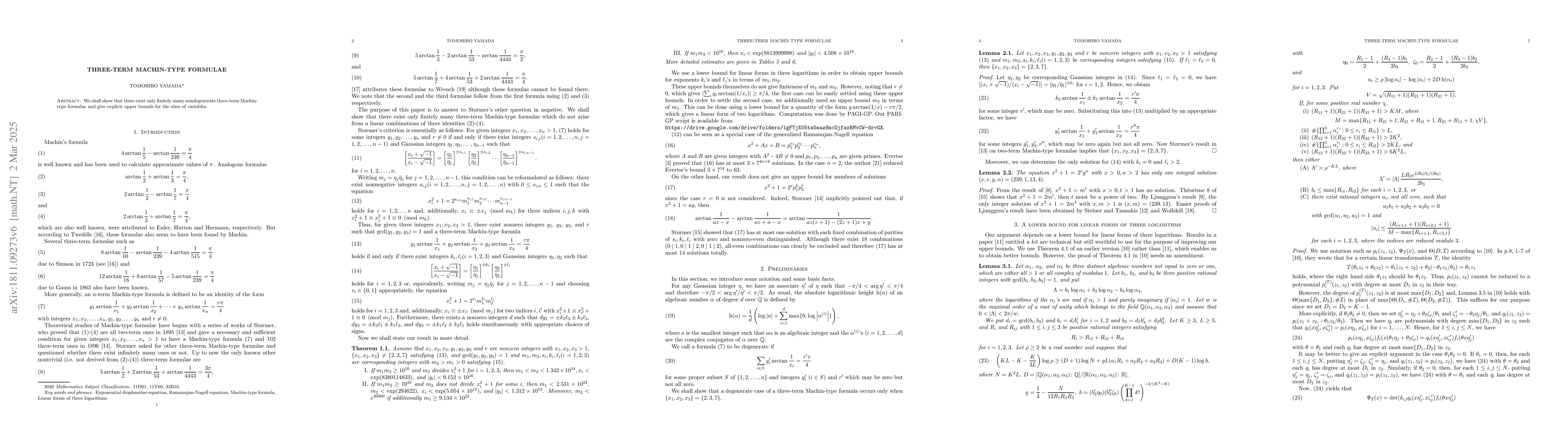 We shall show that there exist only finitely many nondegenerate three-term Machin-type formulae and give explicit upper bounds for the sizes of variables.
