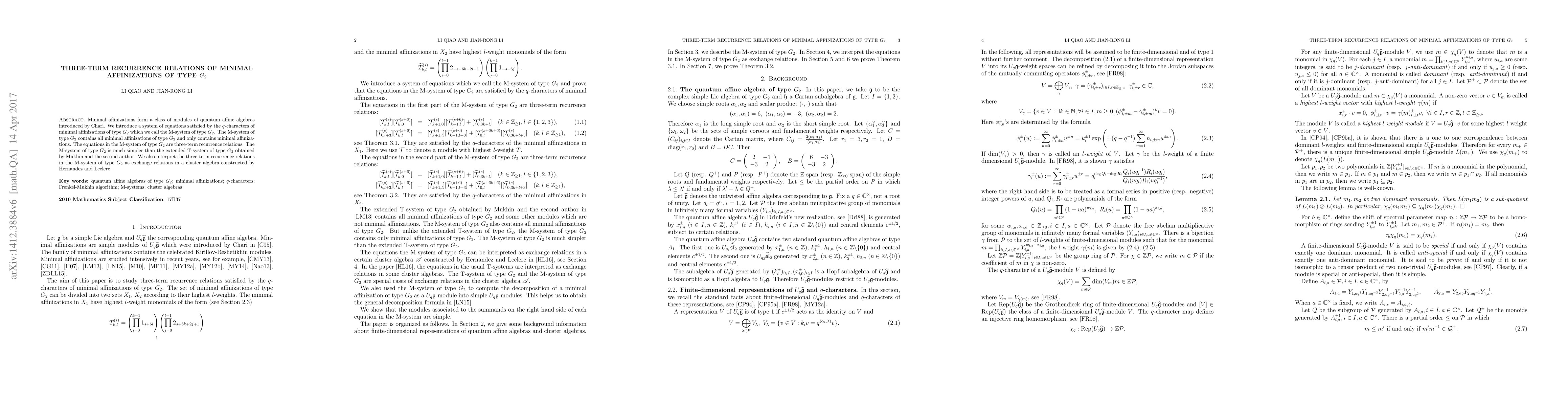 This paper introduces the M-system of type $G_2$, a set of three-term recurrence relations for the $q$-characters of minimal affinizations of quantum affine algebras, which simplifies the extended T-system. It also connects these relations to exchange relations in a cluster algebra.