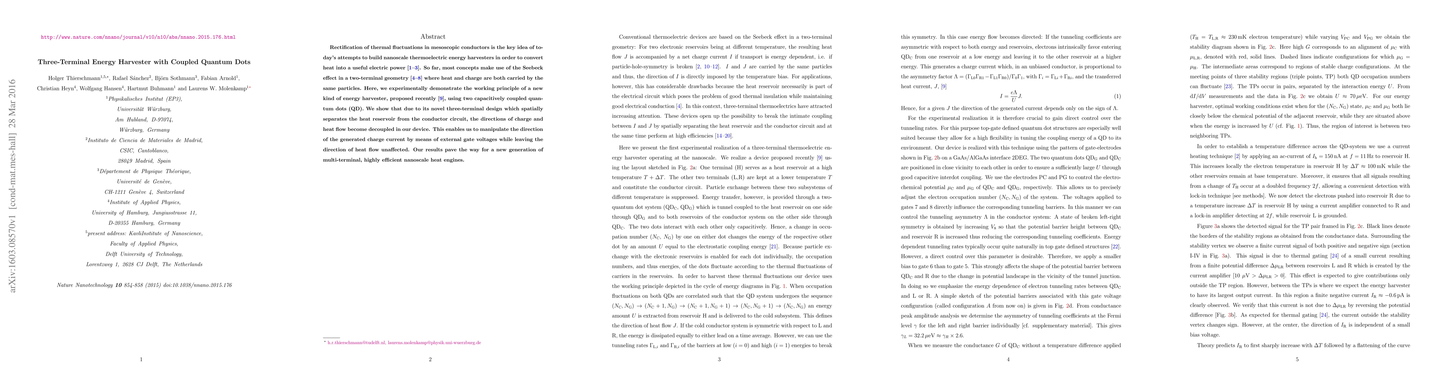 Rectification of thermal fluctuations in mesoscopic conductors is the key idea of today's attempts to build nanoscale thermoelectric energy harvesters in order to convert heat into a useful electric power. So far, most concepts make use of the Seebeck effect in a two-terminal geometry where heat and charge are both carried by the same particles. Here, we experimentally demonstrate the working principle of a new kind of energy harvester, proposed recently using two capacitively coupled quantum dots. We show that due to its novel three-terminal design which spatially separates the heat reservoir from the conductor circuit, the directions of charge and heat flow become decoupled in our device. This enables us to manipulate the direction of the generated charge current by means of external gate voltages while leaving the direction of heat flow unaffected. Our results pave the way for a new generation of multi-terminal, highly efficient nanoscale heat engines.