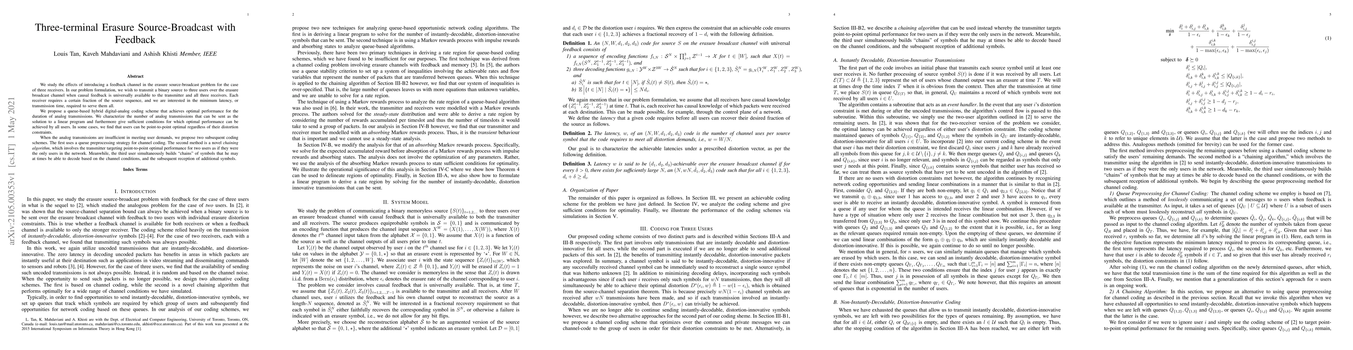 This paper investigates the erasure source-broadcast problem for three receivers with feedback, proposing a hybrid coding scheme that optimizes transmission time. It introduces a queue-based approach for analog transmissions and two subsequent methods for digital coding when analog transmissions are insufficient.