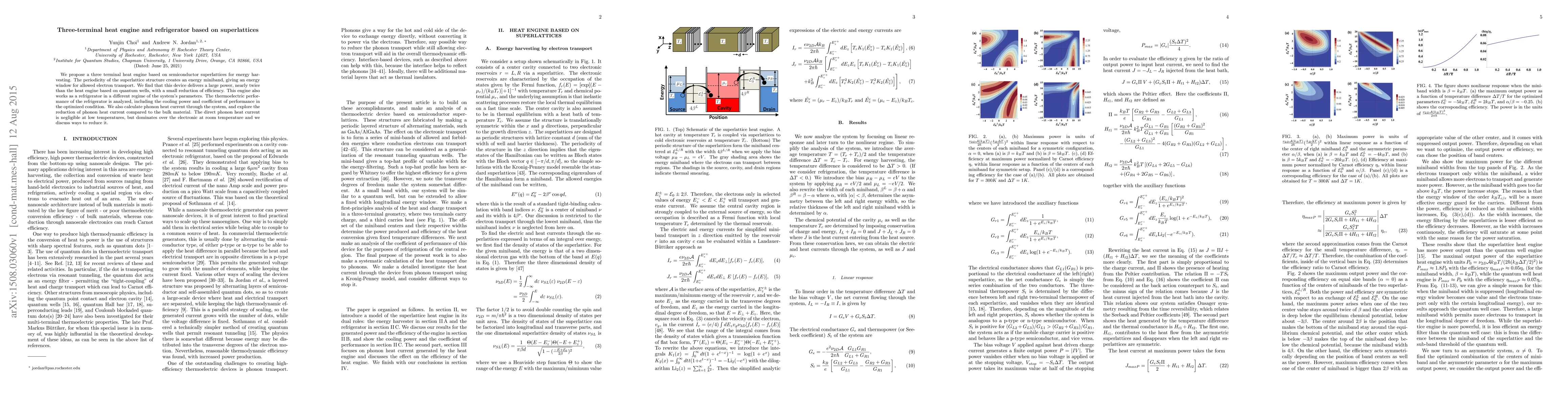 This paper proposes a three-terminal heat engine based on semiconductor superlattices that can also function as a refrigerator. The superlattice structure enhances power output nearly twice that of quantum well-based engines, while maintaining efficiency. The study also analyzes phonon heat current and suggests methods to minimize its impact at room temperature.