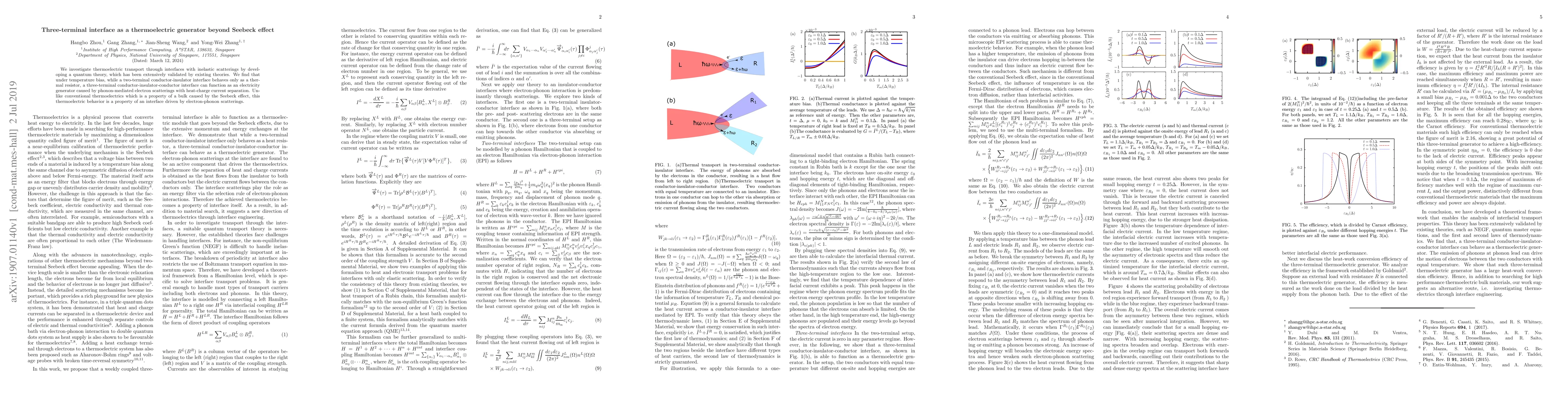 This paper develops a quantum theory to explore thermoelectric transport at interfaces, revealing that a three-terminal conductor-insulator-conductor interface can generate electricity via phonon-mediated electron scatterings, distinct from bulk thermoelectric effects driven by the Seebeck effect. This interface-based thermoelectric behavior enables heat-charge current separation.