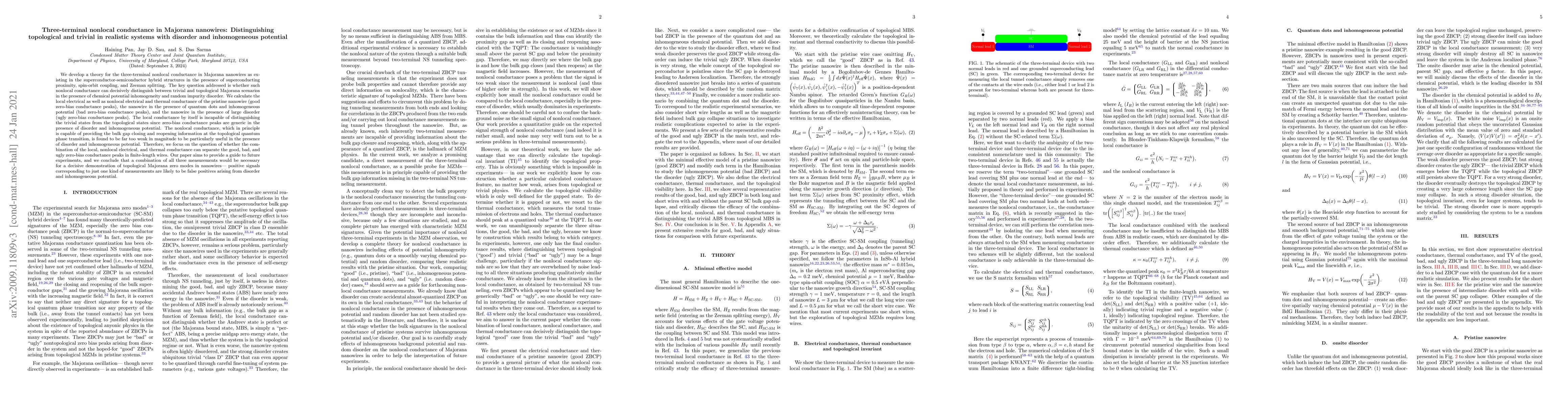 This paper develops a theoretical framework to analyze three-terminal nonlocal conductance in Majorana nanowires, focusing on distinguishing topological from trivial states amidst disorder and inhomogeneous potential. It concludes that while local conductance alone is insufficient, a combination of local, nonlocal electrical, and thermal conductance measurements is necessary to reliably identify topological Majorana zero modes.