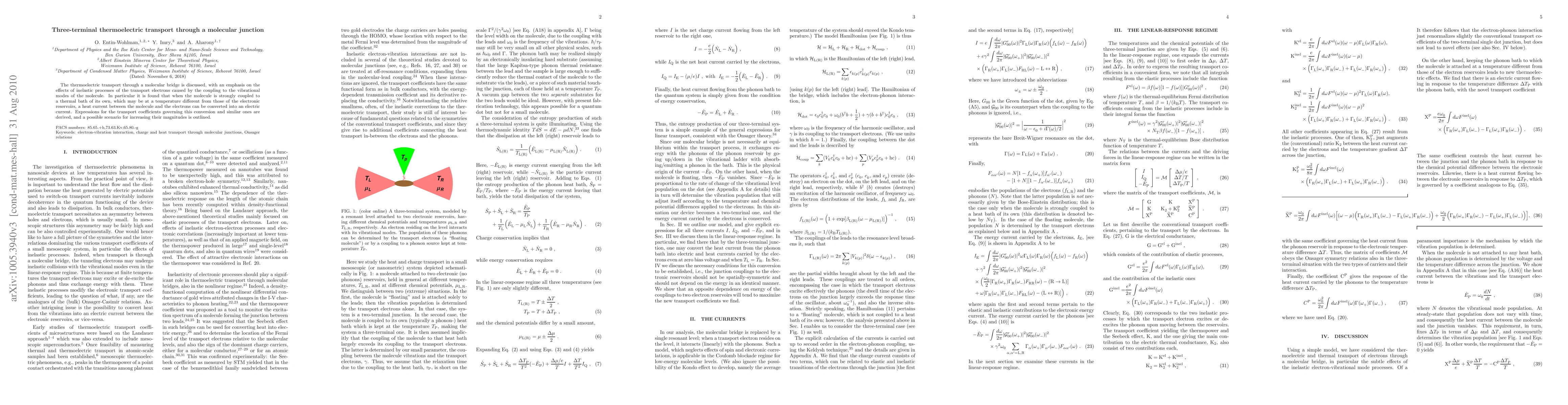 The thermoelectric transport through a molecular bridge is discussed, with an emphasis on the effects of inelastic processes of the transport electrons caused by the coupling to the vibrational modes of the molecule. In particular it is found that when the molecule is strongly coupled to a thermal bath of its own, which may be at a temperature different from those of the electronic reservoirs, a heat current between the molecule and the electrons can be converted into electric current. Expressions for the transport coefficients governing this conversion and similar ones are derived, and a possible scenario for increasing their magnitudes is outlined.