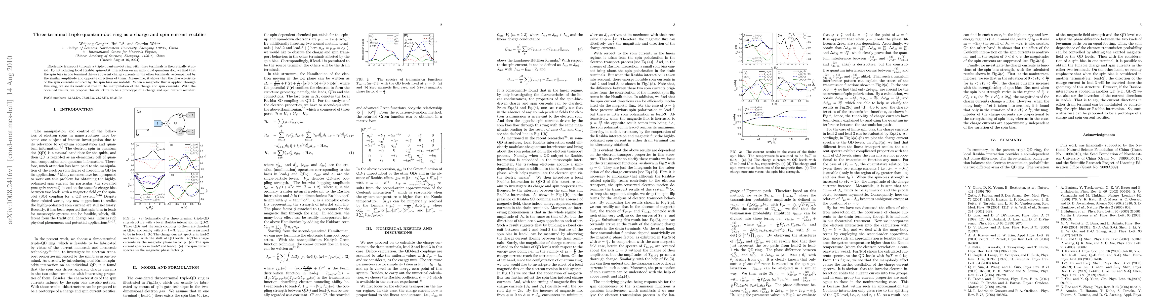 This paper explores a triple-quantum-dot ring with three terminals, demonstrating its potential as a charge and spin current rectifier. The study reveals that spin bias in one terminal can drive charge currents in the others, with notable spin current characteristics influenced by applied magnetic flux.