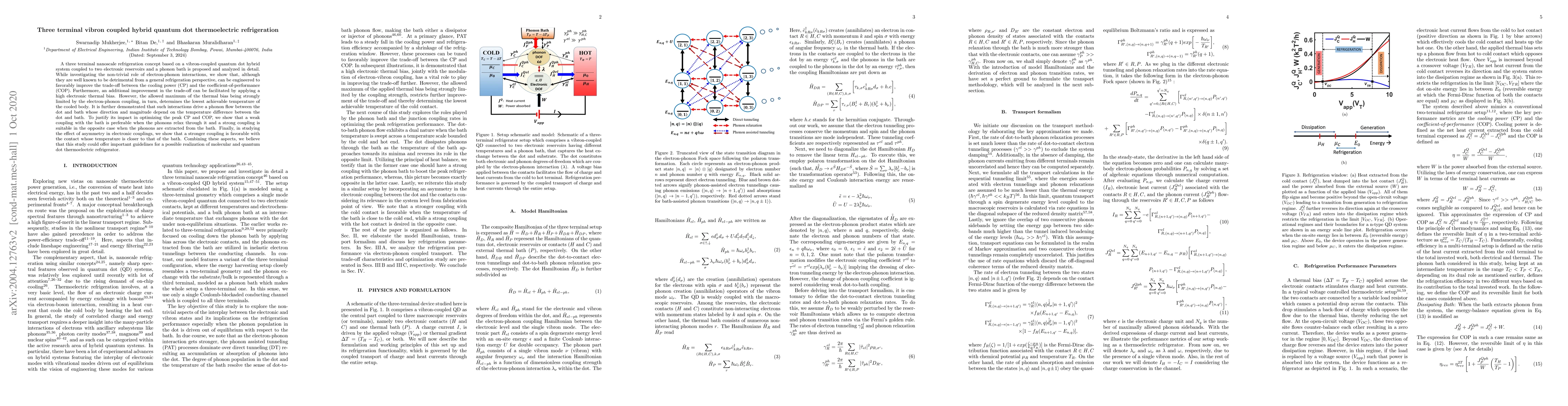A three terminal nanoscale refrigeration concept based on a vibron-coupled quantum dot hybrid system coupled to two electronic reservoirs and a phonon bath is proposed and analyzed in detail. While investigating the non-trivial role of electron-phonon interactions, we show that, although they are well known to be detrimental from a general refrigeration perspective, can be engineered to favorably improve the trade-off between the cooling power (CP) and the coefficient-of-performance (COP). Furthermore, an additional improvement in the trade-off can be facilitated by applying a high electronic thermal bias. However, the allowed maximum of the thermal bias being strongly limited by the electron-phonon coupling, in turn, determines the lowest achievable temperature of the cooled body. It is further demonstrated that such interactions drive a phonon flow between the dot and bath whose direction and magnitude depend on the temperature difference between the dot and bath. To justify its impact in optimizing the peak CP and COP, we show that a weak coupling with the bath is preferable when the phonons relax through it and a strong coupling is suitable in the opposite case when the phonons are extracted from the bath. Finally, in studying the effect of asymmetry in electronic couplings, we show that a stronger coupling is favorable with the contact whose temperature is closer to that of the bath. Combining these aspects, we believe that this study could offer important guidelines for a possible realization of molecular and quantum dot thermoelectric refrigerator.