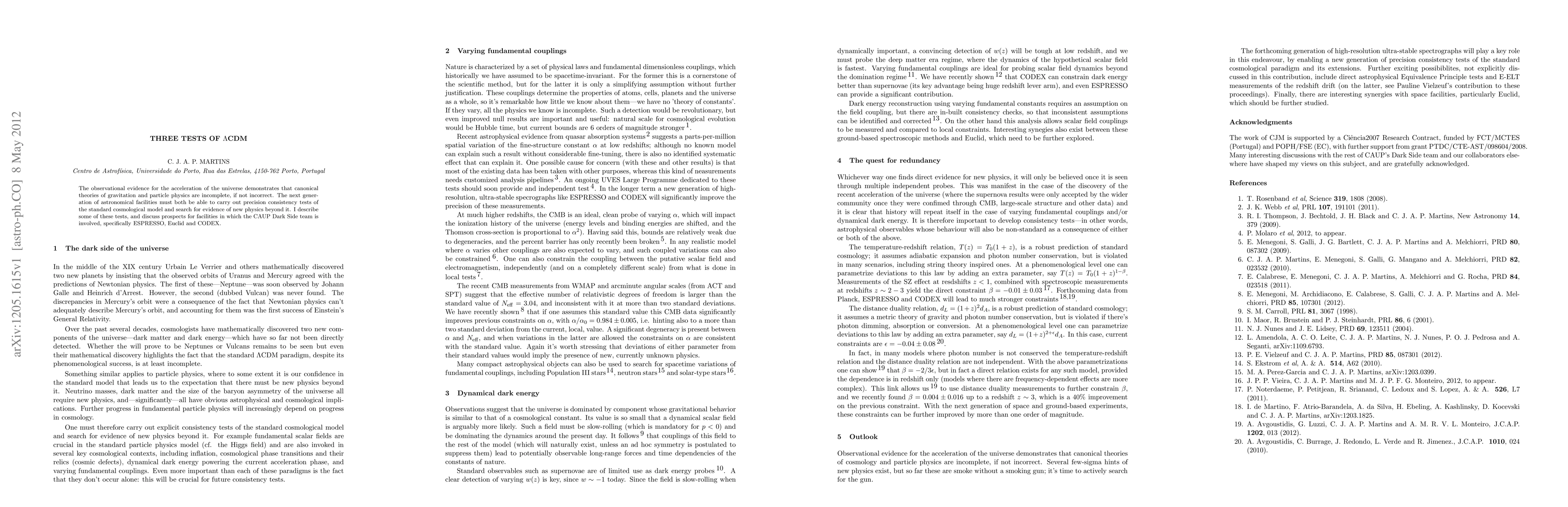 The observational evidence for the acceleration of the universe demonstrates that canonical theories of gravitation and particle physics are incomplete, if not incorrect. The next generation of astronomical facilities must both be able to carry out precision consistency tests of the standard cosmological model and search for evidence of new physics beyond it. I describe some of these tests, and discuss prospects for facilities in which the CAUP Dark Side team is involved, specifically ESPRESSO, Euclid and CODEX.