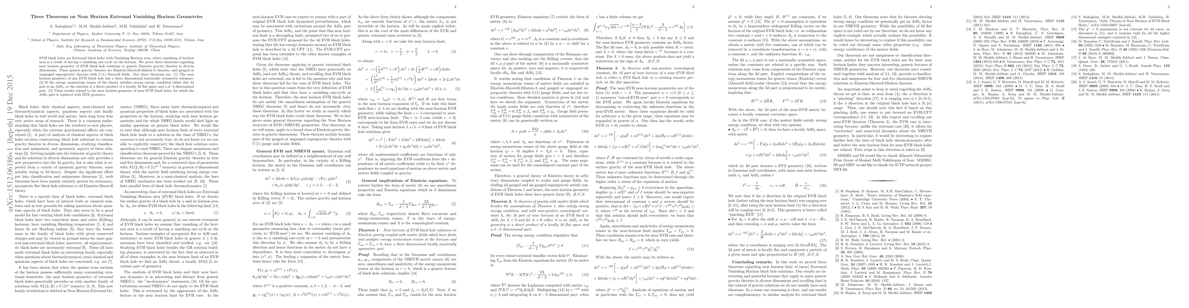 EVH black holes are Extremal black holes with Vanishing Horizon area, where vanishing of horizon area is a result of having a vanishing one-cycle on the horizon. We prove three theorems regarding near horizon geometry of EVH black hole solutions to generic Einstein gravity theories in diverse dimensions. These generic gravity theories are Einstein-Maxwell-dilaton-Lambda theories, and gauged or ungauged supergravity theories with U(1) Maxwell fields. Our three theorems are: (1) The near horizon geometry of any EVH black hole has a three dimensional maximally symmetric subspace. (2) If the energy momentum tensor of the theory satisfies strong energy condition either this 3d part is an AdS3, or the solution is a direct product of a locally 3d flat space and a d-3 dimensional part. (3) These results extend to the near horizon geometry of near-EVH black holes, for which the AdS3 part is replaced with BTZ geometry.