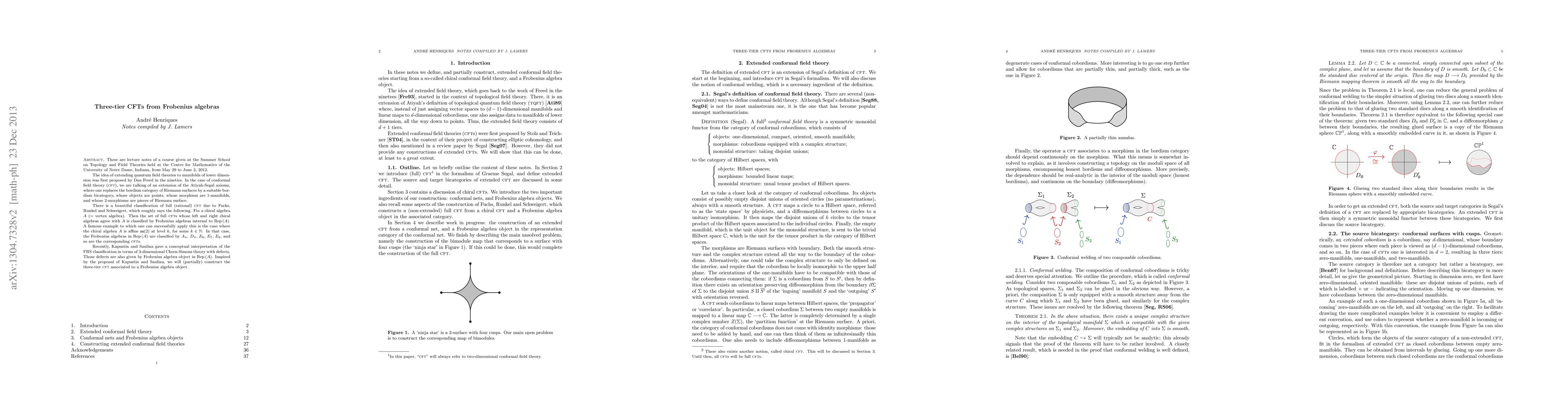 These are lecture notes of a course given at the Summer School on Topology and Field Theories held at the Centre for Mathematics of the University of Notre Dame, Indiana, from May 29 to June 2, 2012. The idea of extending quantum field theories to manifolds of lower dimension was first proposed by Dan Freed in the nineties. In the case of conformal field theory (CFT), we are talking of an extension of the Atiyah-Segal axioms, where one replaces the bordism category of Riemann surfaces by a suitable bordism bicategory, whose ob jects are points, whose morphisms are 1-manifolds, and whose 2-morphisms are pieces of Riemann surface. There is a beautiful classification of full (rational) CFTs due to Fuchs, Runkel and Schweigert, which roughly says the following. Fix a chiral algebra A (= vertex algebra). Then the set of full cfts whose left and right chiral algebras agree with A is classified by Frobenius algebras internal to Rep(A). A famous example to which one can successfully apply this is the case where the chiral algebra A is affine su(2) at level k, for some k in N. In that case, the Frobenius algebras in Rep (A) are classified by A_n, D_n, E_6, E_7, E_8, and so are the corresponding CFTs. Recently, Kapustin and Saulina gave a conceptual interpretation of the FRS classification in terms of 3-dimensional Chern-Simons theory with defects. Those defects are also given by Frobenius algebra ob ject in Rep(A). Inspired by the proposal of Kapustin and Saulina, we will (partially) construct the three-tier CFT associated to a Frobenius algebra object.