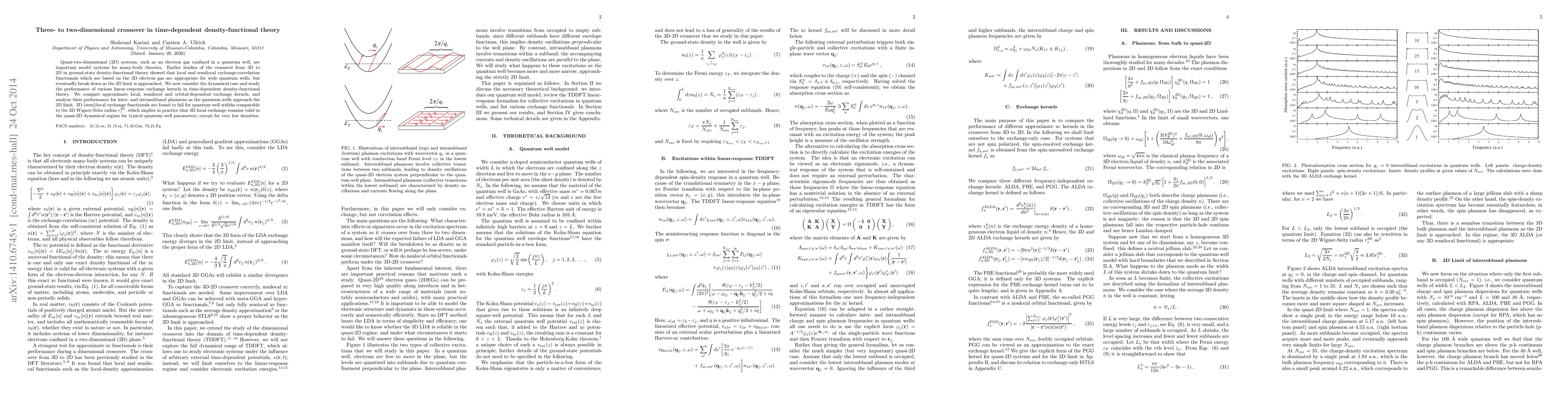 This paper investigates the performance of various exchange kernels in time-dependent density-functional theory for quasi-two-dimensional electron systems, finding that 3D (semi)local exchange functionals fail as quantum wells approach the 2D limit, except for typical quantum well parameters and densities.