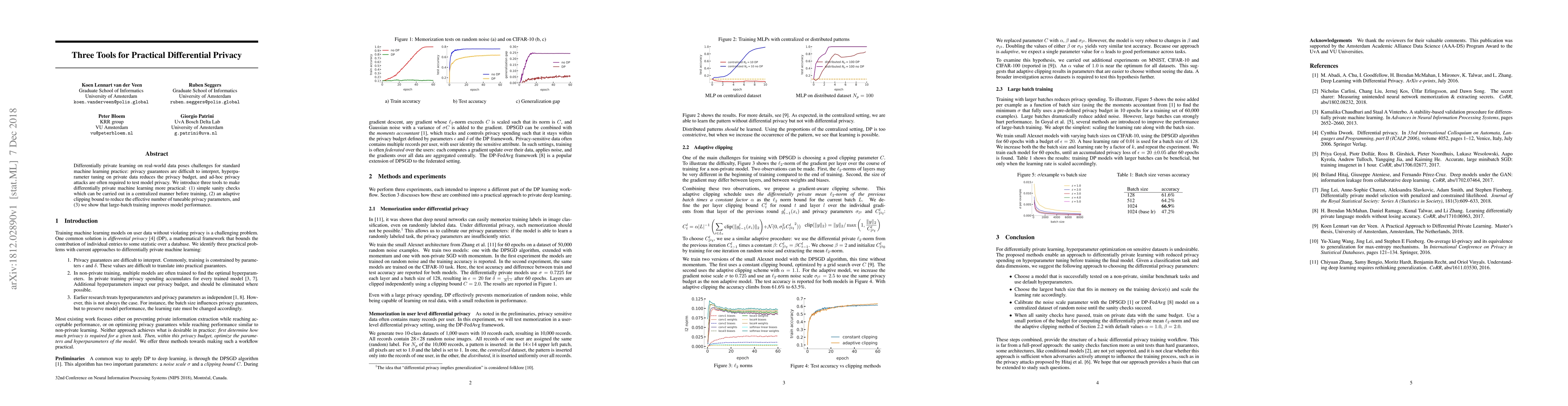 This paper introduces three tools to enhance practical differentially private machine learning: centralized sanity checks, an adaptive clipping bound to simplify hyperparameter tuning, and evidence that large-batch training enhances model performance. These tools aim to address challenges in privacy interpretation, budget reduction, and privacy testing.