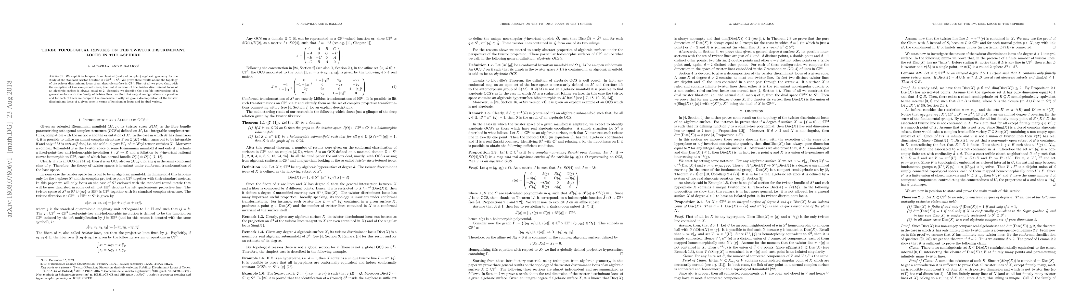 The paper proves three topological results about the twistor discriminant locus of an algebraic surface in CP^3, including its real dimension and possible intersections with twistor lines, shedding light on the topology of this complex geometric object.