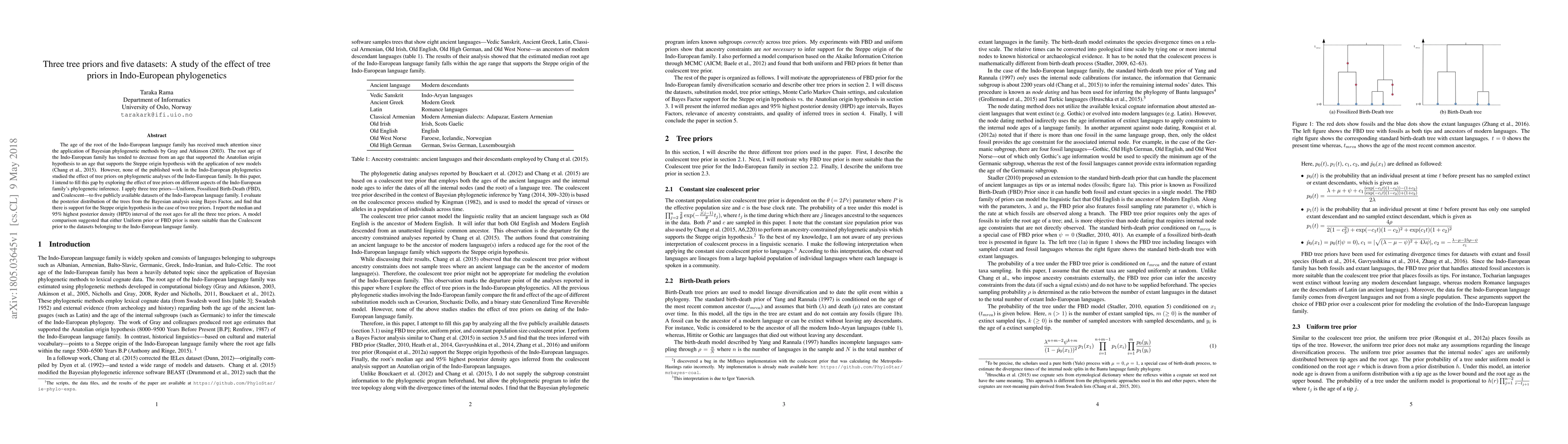 This study investigates the impact of different tree priors on the phylogenetic inference of the Indo-European language family using five datasets. The analysis reveals support for the Steppe origin hypothesis with two tree priors and suggests that the Uniform or Fossilized Birth-Death priors are more suitable than the Coalescent prior for these datasets.