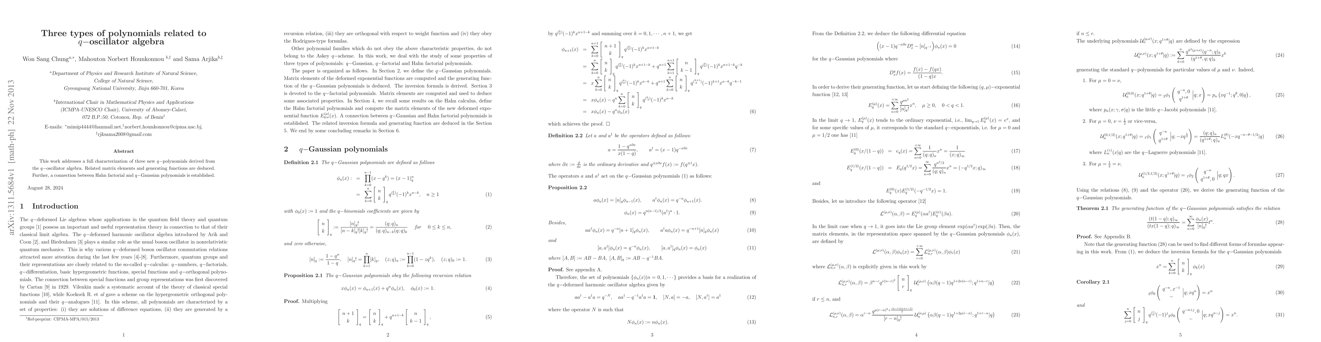 This work addresses a full characterization of three new q-polynomials derived from the $q-$oscillator algebra. Related matrix elements and generating functions are deduced. Further, a connection between Hahn factorial and q-Gaussian polynomials is established.