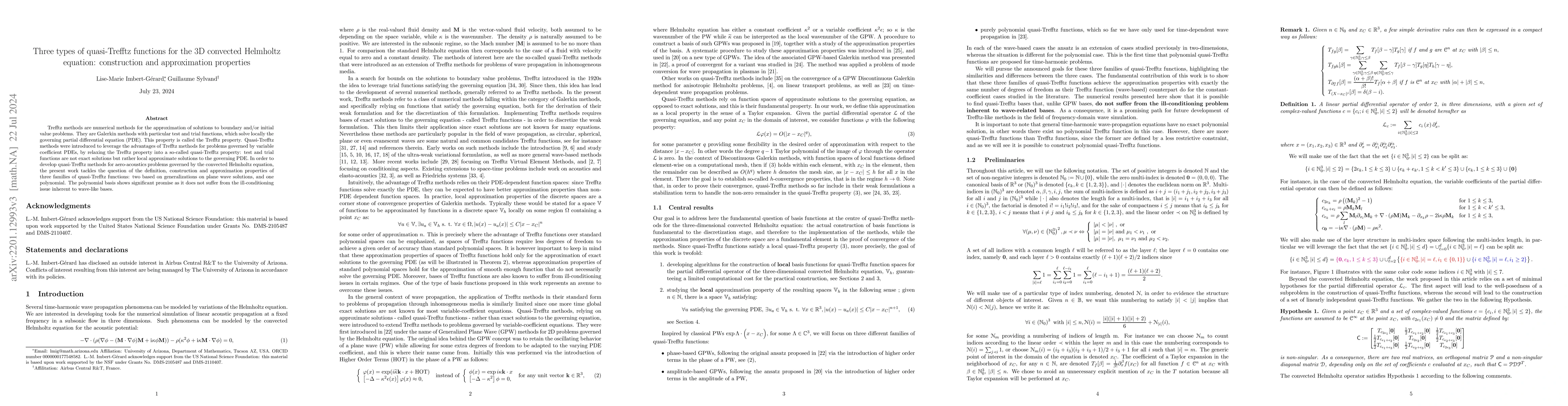 This paper introduces three types of quasi-Trefftz functions for solving the 3D convected Helmholtz equation, focusing on their construction and approximation properties. The polynomial basis shows promise due to its resistance to ill-conditioning issues compared to wave-like bases.