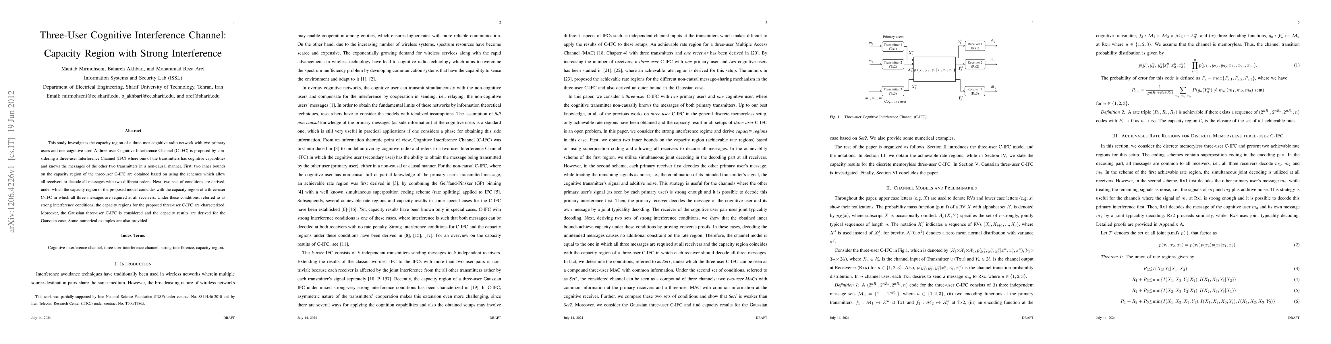 This study investigates the capacity region of a three-user cognitive radio network with two primary users and one cognitive user. A three-user Cognitive Interference Channel (C-IFC) is proposed by considering a three-user Interference Channel (IFC) where one of the transmitters has cognitive capabilities and knows the messages of the other two transmitters in a non-causal manner. First, two inner bounds on the capacity region of the three-user C-IFC are obtained based on using the schemes which allow all receivers to decode all messages with two different orders. Next, two sets of conditions are derived, under which the capacity region of the proposed model coincides with the capacity region of a three-user C-IFC in which all three messages are required at all receivers. Under these conditions, referred to as strong interference conditions, the capacity regions for the proposed three-user C-IFC are characterized. Moreover, the Gaussian three-user C-IFC is considered and the capacity results are derived for the Gaussian case. Some numerical examples are also provided.