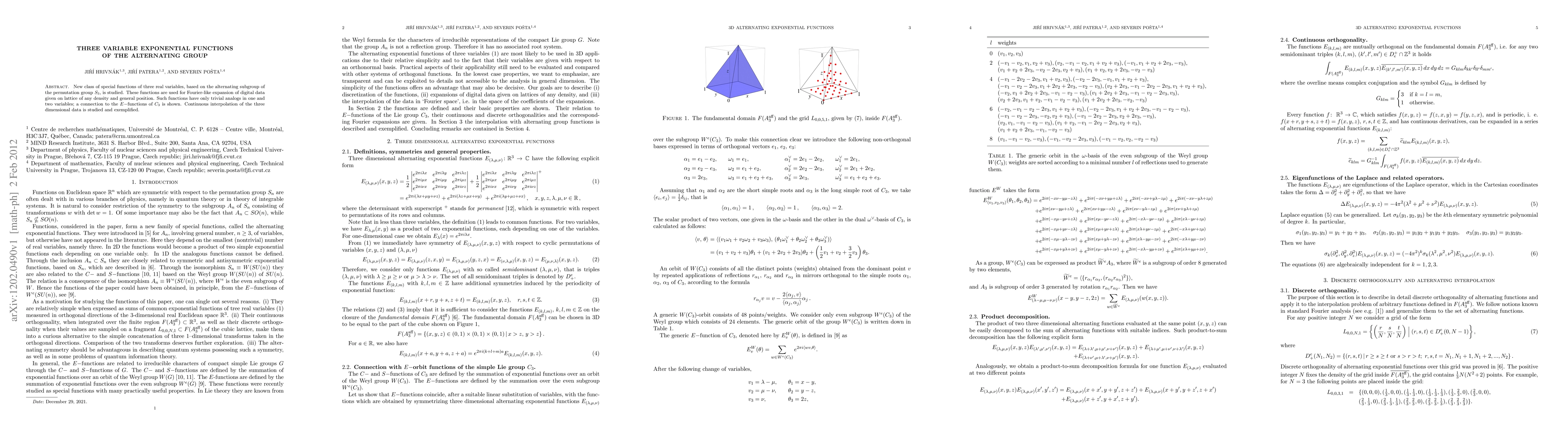 This paper introduces a new class of three-variable exponential functions based on the alternating subgroup of $S_3$ for Fourier-like expansions of lattice data. It demonstrates their application in continuous interpolation of three-dimensional data and connects them to $E$-functions of $C_3$.