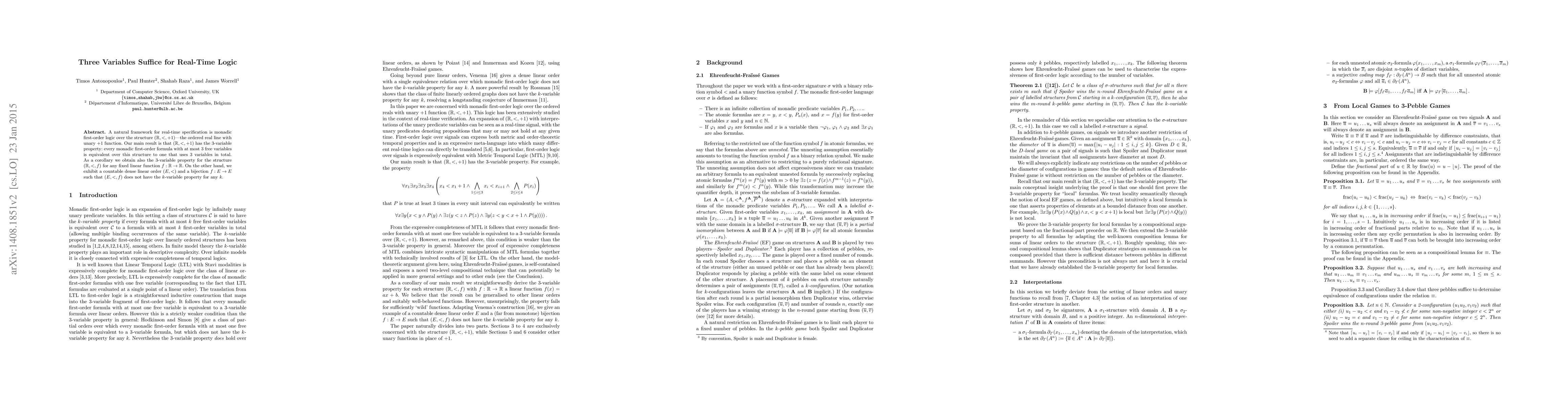 A natural framework for real-time specification is monadic first-order logic over the structure $(\mathbb{R},<,+1)$---the ordered real line with unary $+1$ function. Our main result is that $(\mathbb{R},<,+1)$ has the 3-variable property: every monadic first-order formula with at most 3 free variables is equivalent over this structure to one that uses 3 variables in total. As a corollary we obtain also the 3-variable property for the structure $(\mathbb{R},<,f)$ for any fixed linear function $f:\mathbb{R}\rightarrow\mathbb{R}$. On the other hand, we exhibit a countable dense linear order $(E,<)$ and a bijection $f:E\rightarrow E$ such that $(E,<,f)$ does not have the $k$-variable property for any $k$.