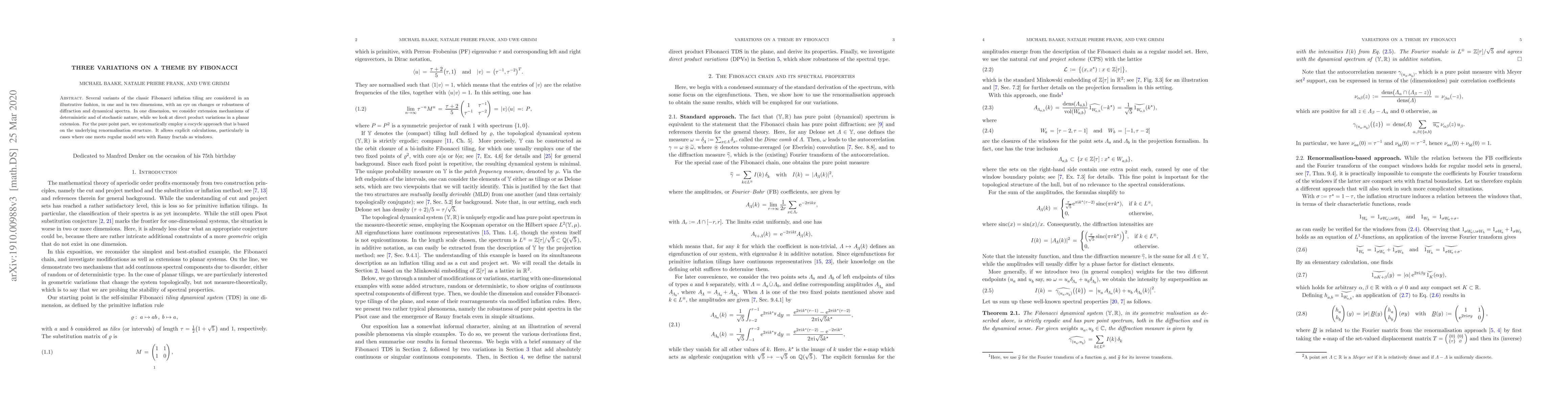 Several variants of the classic Fibonacci inflation tiling are considered in an illustrative fashion, in one and in two dimensions, with an eye on changes or robustness of diffraction and dynamical spectra. In one dimension, we consider extension mechanisms of deterministic and of stochastic nature, while we look at direct product variations in a planar extension. For the pure point part, we systematically employ a cocycle approach that is based on the underlying renormalisation structure. It allows explicit calculations, particularly in cases where one meets regular model sets with Rauzy fractals as windows.