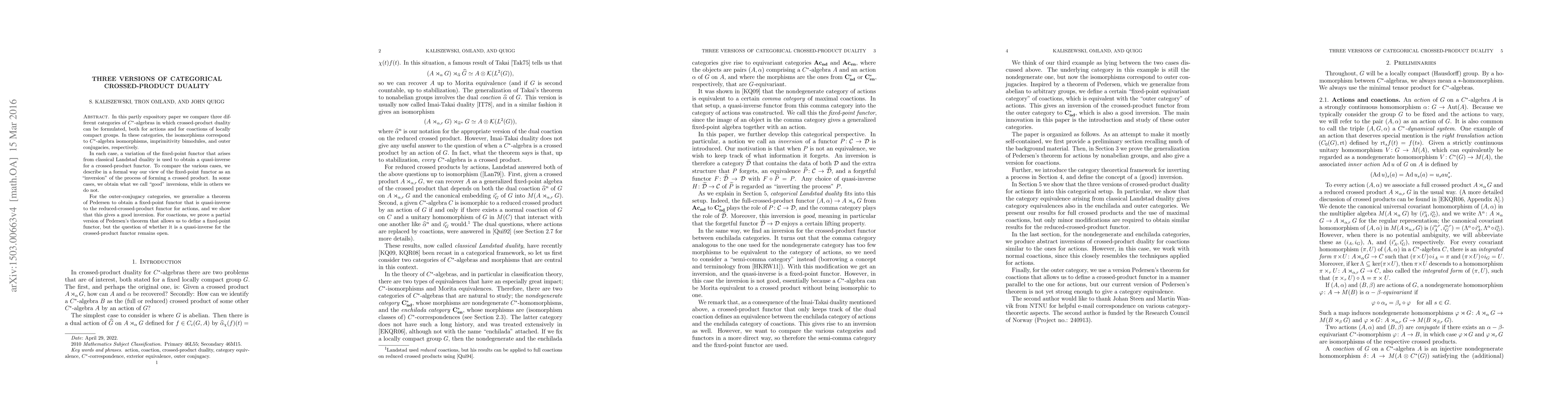 This paper compares three C*-algebra categories where crossed-product duality applies, examining isomorphisms via C*-algebra isomorphisms, imprimitivity bimodules, and outer conjugacies. It explores variations of the fixed-point functor from Landstad duality to create quasi-inverses for crossed-product functors, achieving 'good' inversions for outer-conjugacy categories and partial results for coactions.