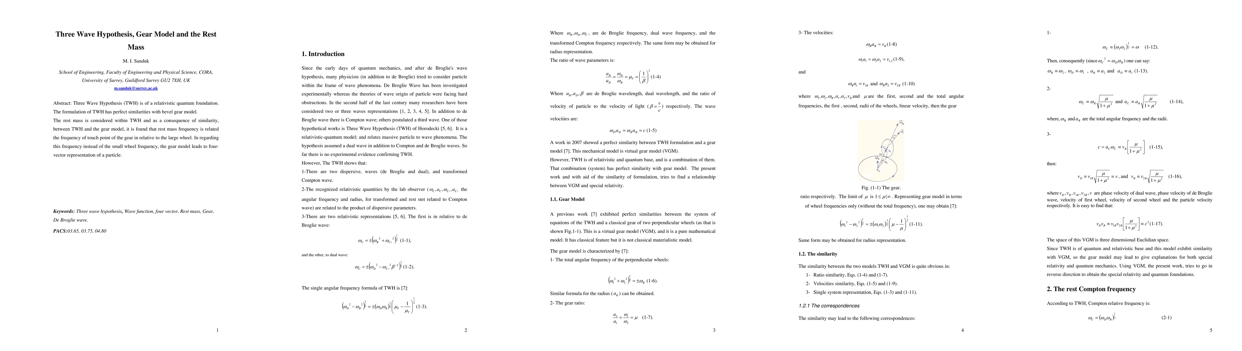 Three Wave Hypothesis (TWH) is of a relativistic quantum foundation. The formulation of TWH has perfect similarities with bevel gear model. The rest mass is considered within TWH and as a consequence of similarity, between TWH and the gear model, it is found that rest mass frequency is related the frequency of touch point of the gear in relative to the large wheel. In regarding this frequency instead of the small wheel frequency, the gear model leads to four-vector representation of a particle.