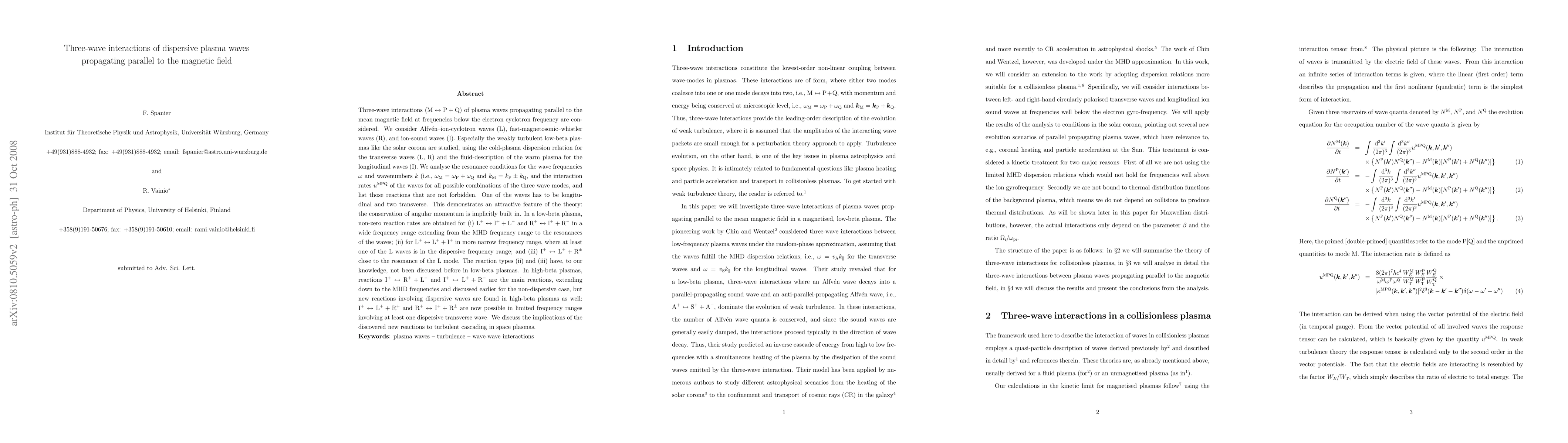 Three-wave interactions of plasma waves propagating parallel to the mean magnetic field at frequencies below the electron cyclotron frequency are considered. We consider Alfv\'en--ion-cyclotron waves, fast-magnetosonic--whistler waves, and ion-sound waves. Especially the weakly turbulent low-beta plasmas like the solar corona are studied, using the cold-plasma dispersion relation for the transverse waves and the fluid-description of the warm plasma for the longitudinal waves. We analyse the resonance conditions for the wave frequencies $\omega$ and wavenumbers $k$, and the interaction rates of the waves for all possible combinations of the three wave modes, and list those reactions that are not forbidden.