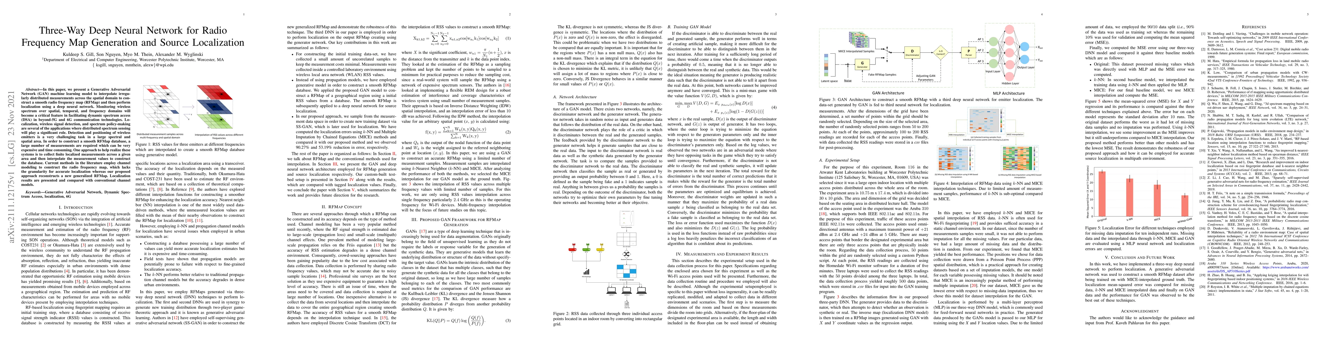 This paper proposes a GAN-based deep neural network for generating smooth radio frequency maps from sparse measurements and localizing wireless signals, addressing the challenges of dynamic spectrum access in future communication technologies. The approach outperforms conventional channel models in localization accuracy.