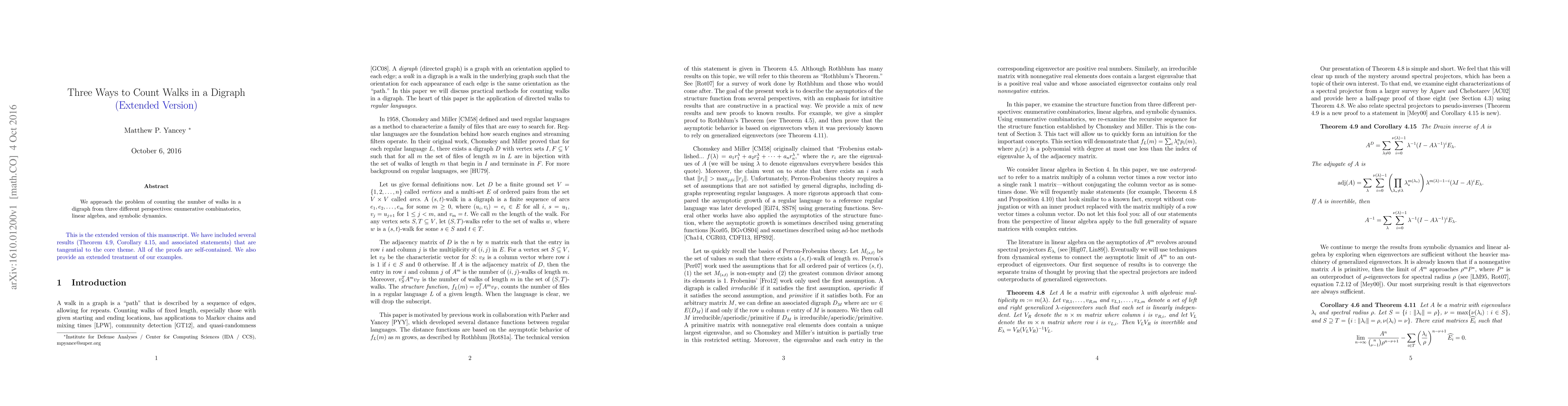 We approach the problem of counting the number of walks in a digraph from three different perspectives: enumerative combinatorics, linear algebra, and symbolic dynamics.