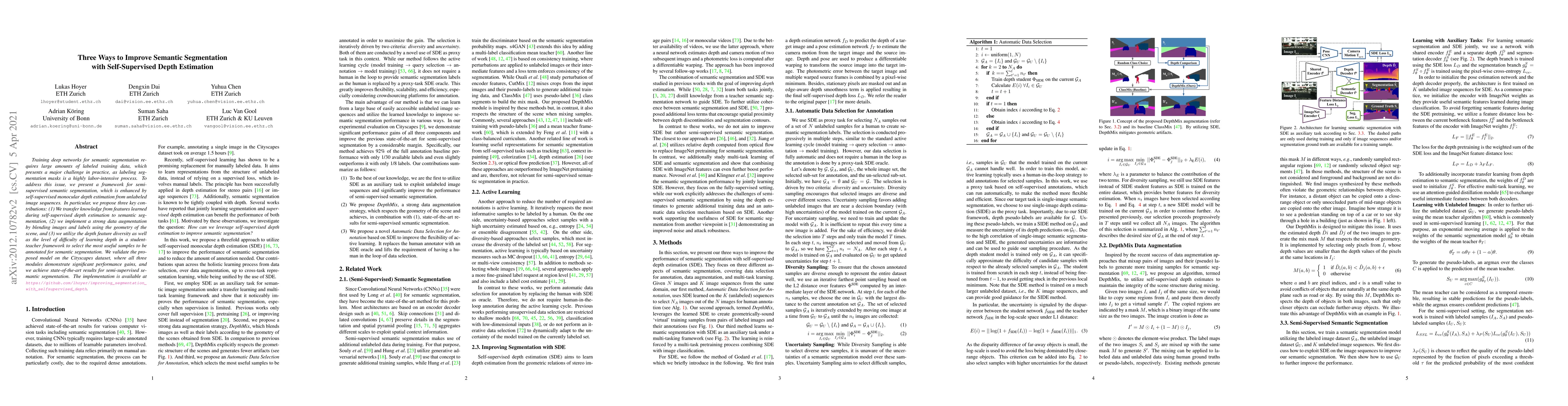 This paper proposes a framework for semi-supervised semantic segmentation that leverages self-supervised monocular depth estimation to reduce the need for labeled data. It introduces three methods: transferring knowledge from depth estimation, data augmentation through image blending, and a student-teacher approach to select useful samples for annotation. The model achieves state-of-the-art results on the Cityscapes dataset.