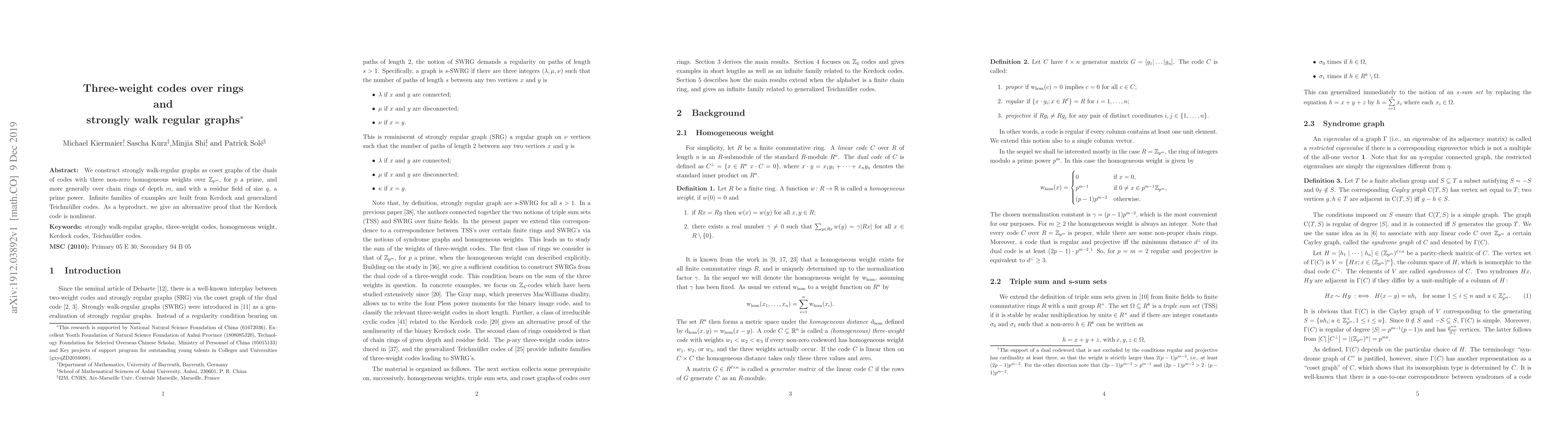 The paper constructs strongly walk-regular graphs as coset graphs of the duals of codes with three non-zero homogeneous weights over $\mathbb{Z}_{p^m}$ and chain rings of depth $m$, providing an alternative proof that the Kerdock code is nonlinear.