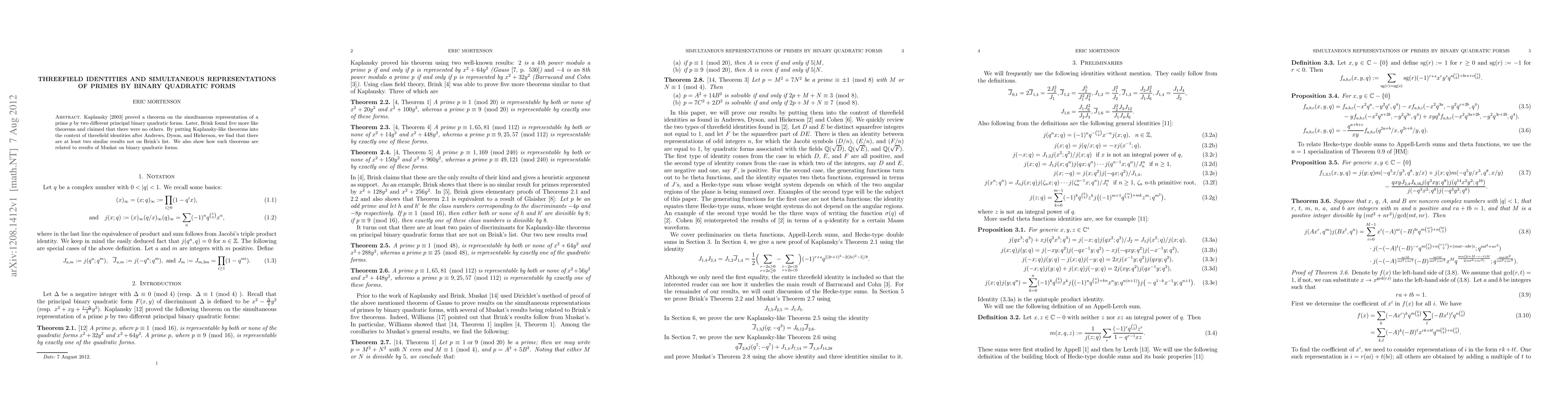 Kaplansky [2003] proved a theorem on the simultaneous representation of a prime $p$ by two different principal binary quadratic forms. Later, Brink found five more like theorems and claimed that there were no others. By putting Kaplansky-like theorems into the context of threefield identities after Andrews, Dyson, and Hickerson, we find that there are at least two similar results not on Brink's list. We also show how such theorems are related to results of Muskat on binary quadratic forms