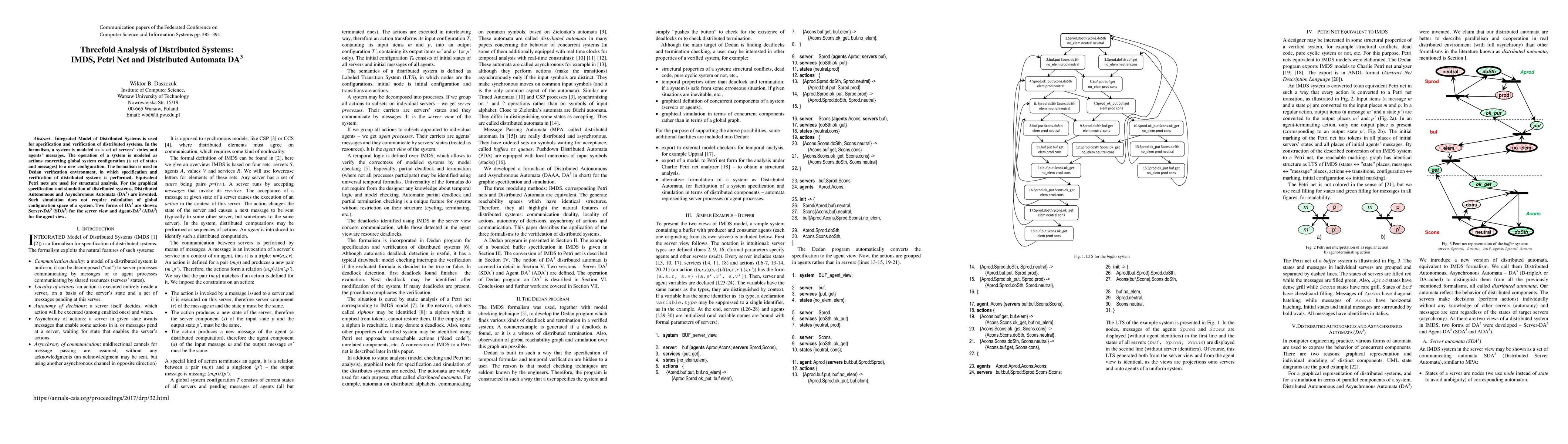 This paper presents three formalisms for modeling and analyzing distributed systems: IMDS for specification and verification, Petri nets for structural analysis, and DA3 for graphical specification and simulation without global configuration space computation. The paper introduces Server-DA3 and Agent-DA3 for different system views.