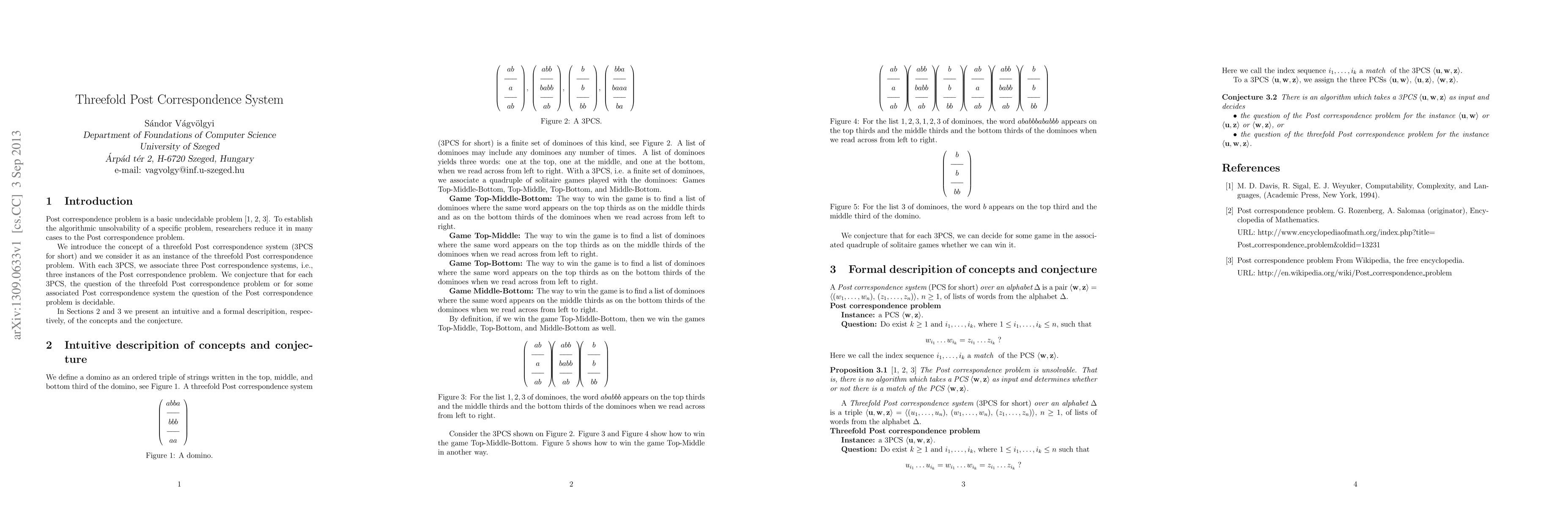 We introduce the concept of a threefold Post correspondence system (3PCS for short) and we consider it as an instance of the threefold Post correspondence problem. With each 3PCS, we associate three Post correspondence systems, i.e., three instances of the Post correspondence problem. We conjecture that for each 3PCS, the question of the threefold Post correspondence problem or for some associated Post correspondence system the question of the Post correspondence problem is decidable.